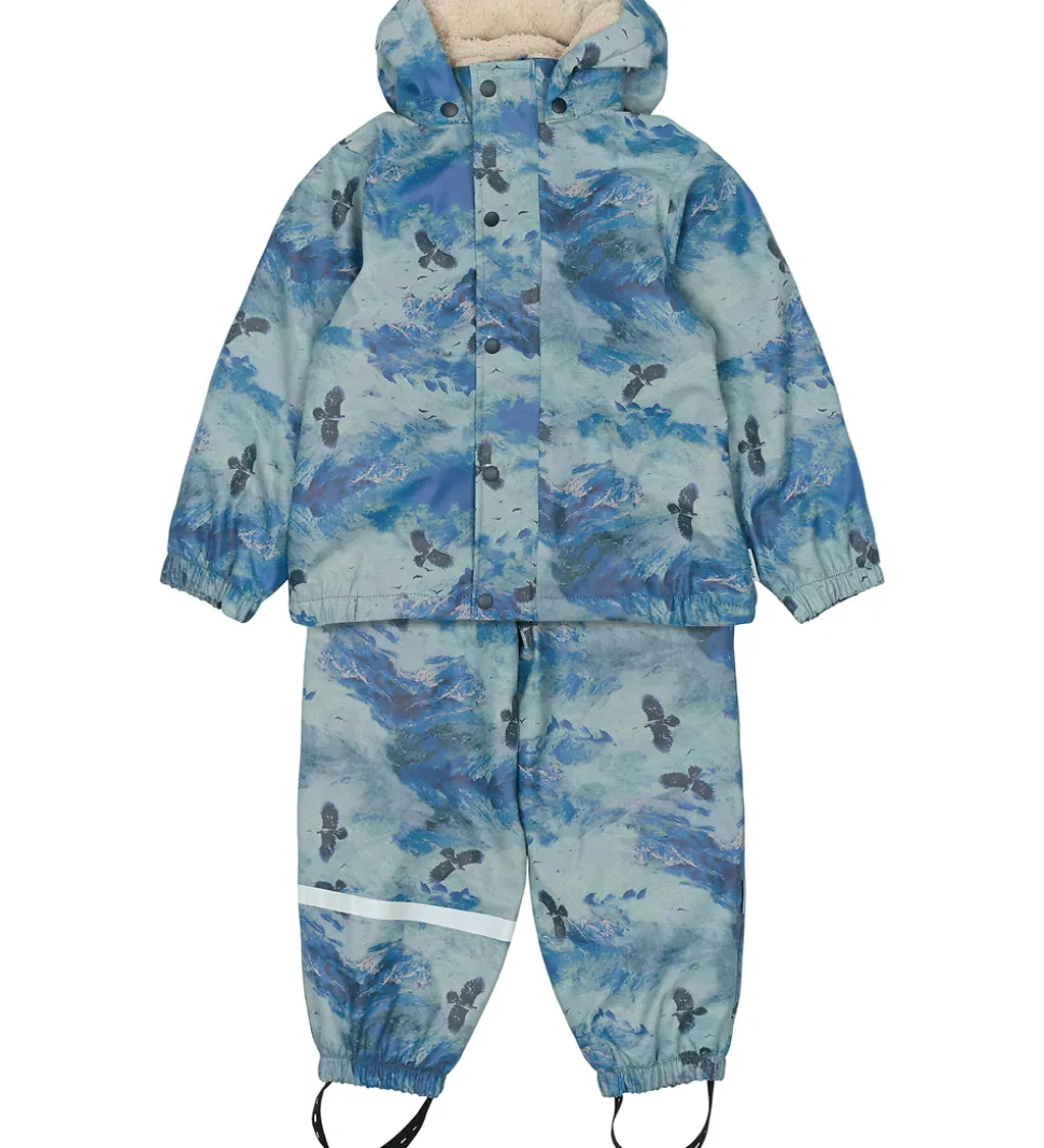 Smart Mikk-Line regntøj, der består af en regnjakke og et par regnbukser i PU med et alloverprint med sneklædte bjerge i blå nuancer og med flyvende ørne.