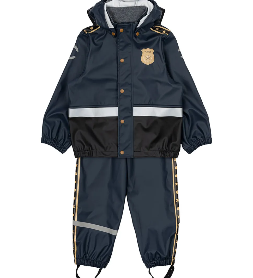 Sejt Mikk-Line regntøj af PU bestående af et par regnbukser med seler og en regnjakke. Regntøjet er navyblåt og i et politibetjent-design, som er lavet med flotte print, så regntøjet ligner en politiuniform.