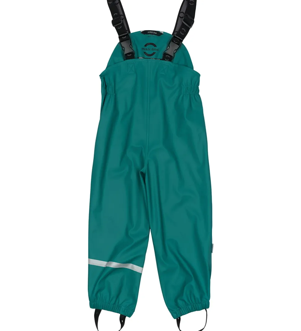 Pænt Mikk-Line regntøj bestående af et par regnbukser med seler og en regnjakke i ensfarvet grønturkis samt med velplacerede refleksdetaljer og -logoer.