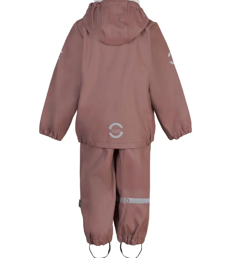 Skønt Mikk-Line regntøj bestående af en regnjakke og et par regnbukser i ensfarvet, mørkerosa PU.