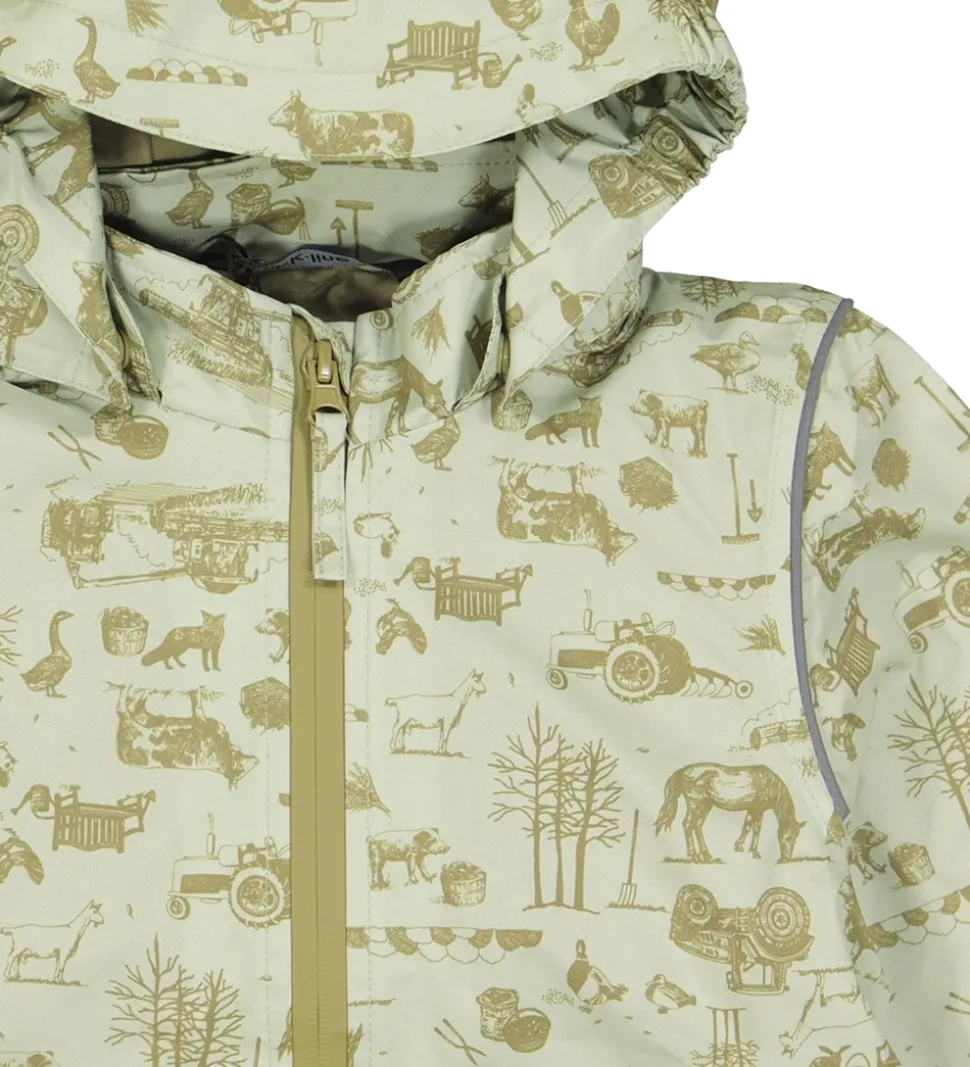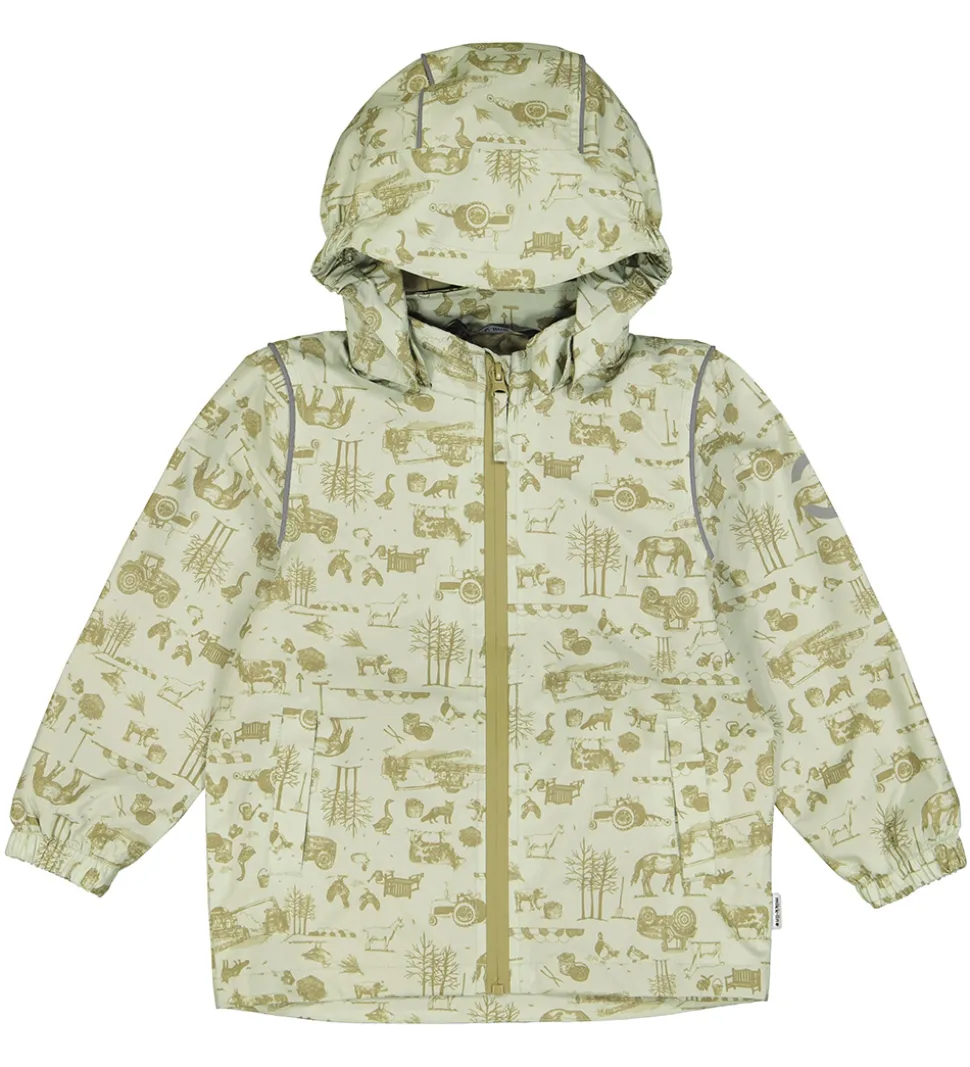 Dejlig Mikk-Line sommerjakke i lys grøn med et alloverbondegårdsprint i en mørk nuance.