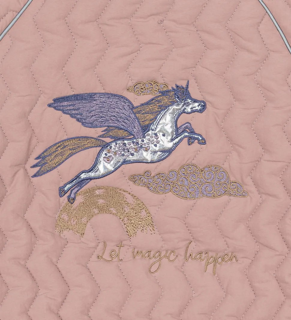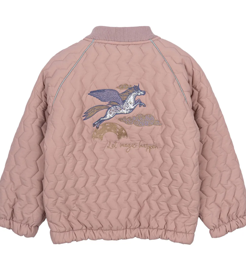 Fed Mikk-Line sommerjakke i rosa med en quiltet, zigzagget struktur. På ryggen er der broderet en enhjørning.