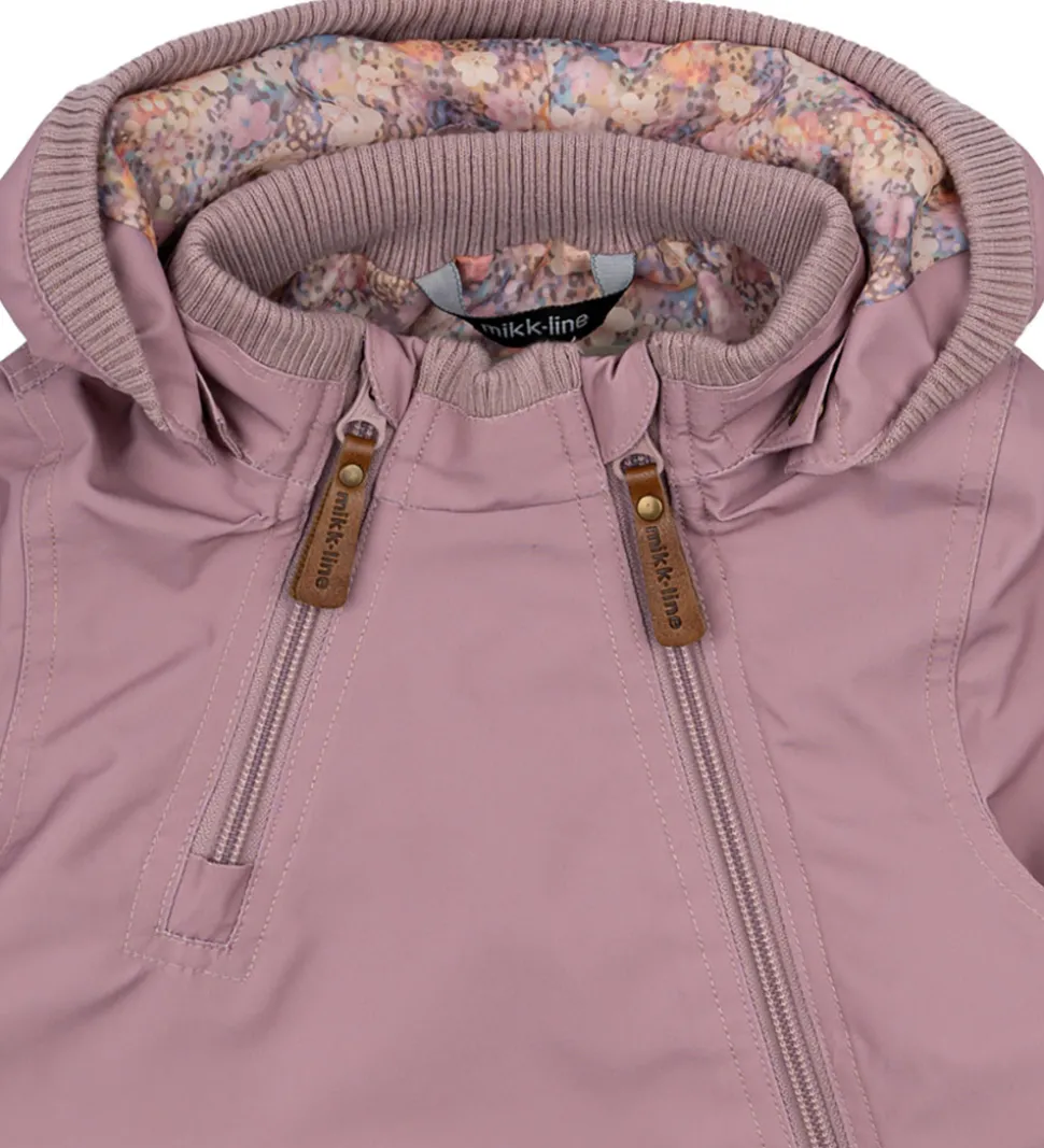 Mikk-Line sommerjakken har en aftagelig hætte, der sidder fast med trykknapper omkring den ribforede halskrave. Hætten har en spids hovedform og en blød ribkant i ansigtsåbningen. Sommerjakkens lange ærmer er med praktiske vindfang og brede ribkanter i åbningerne.