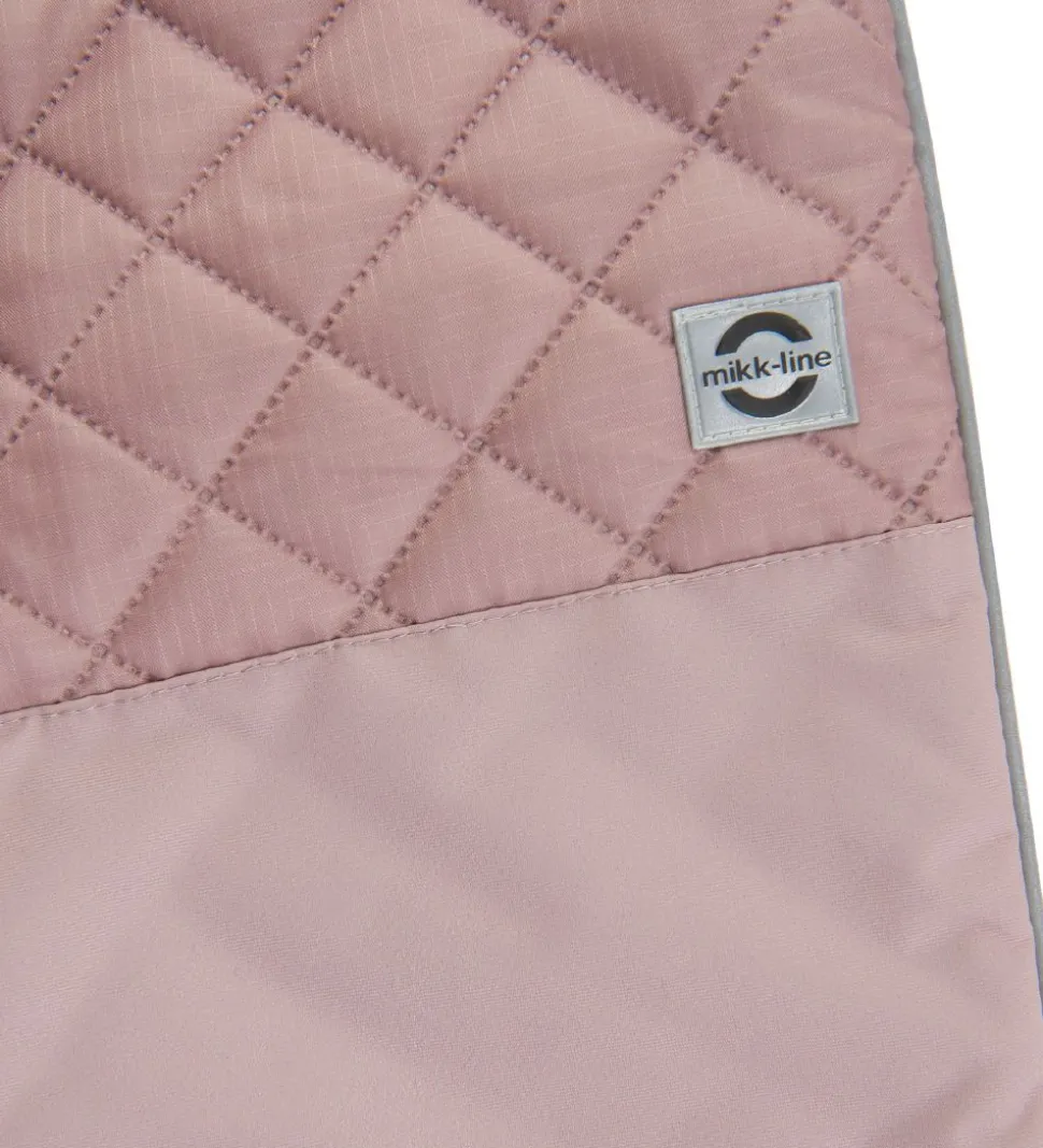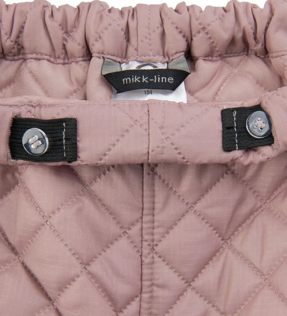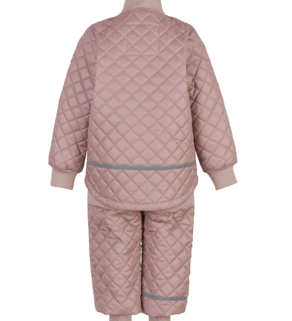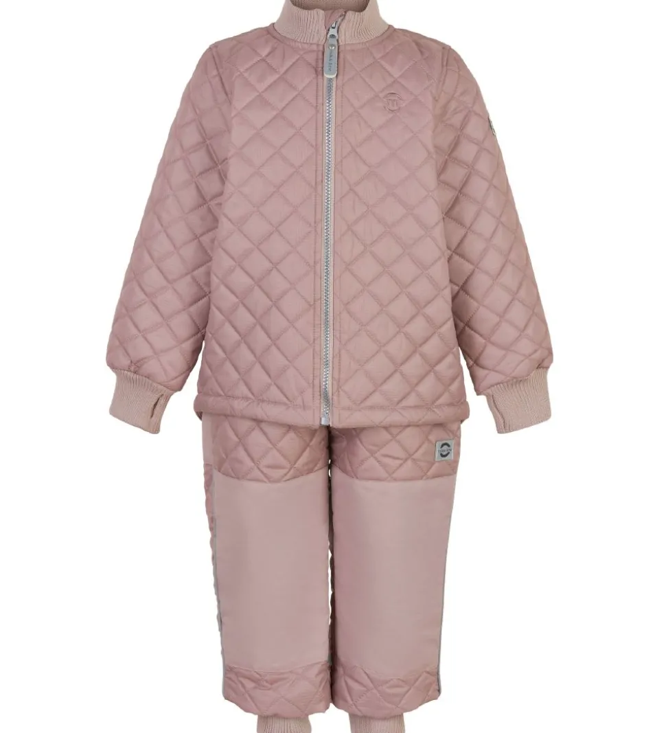 Sødt Mikk-Line termotøj bestående af en termojakke og et par termobukser i rosa med en quiltet struktur.