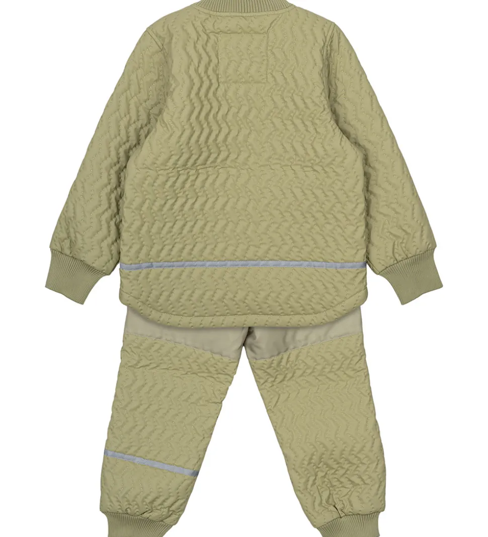 Lækkert Mikk-Line termotøj bestående af en termojakke og et par termobukser i lys, støvet grøn. Termotøjet har en struktur af striber med indprægede, små prikker.