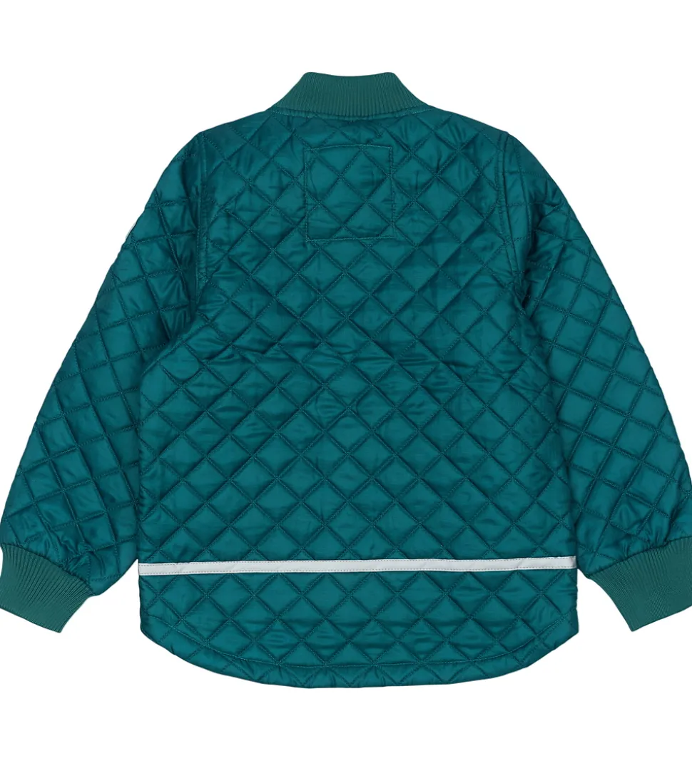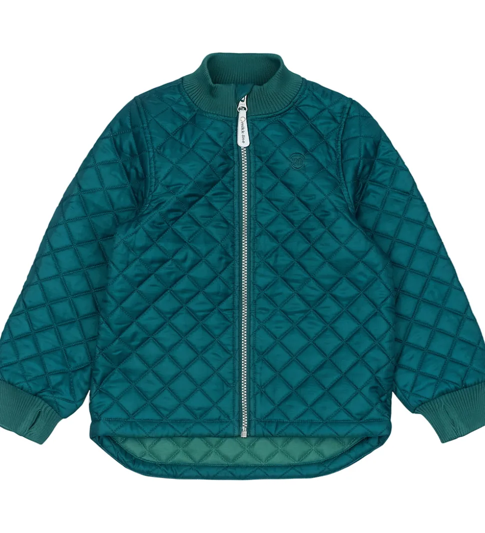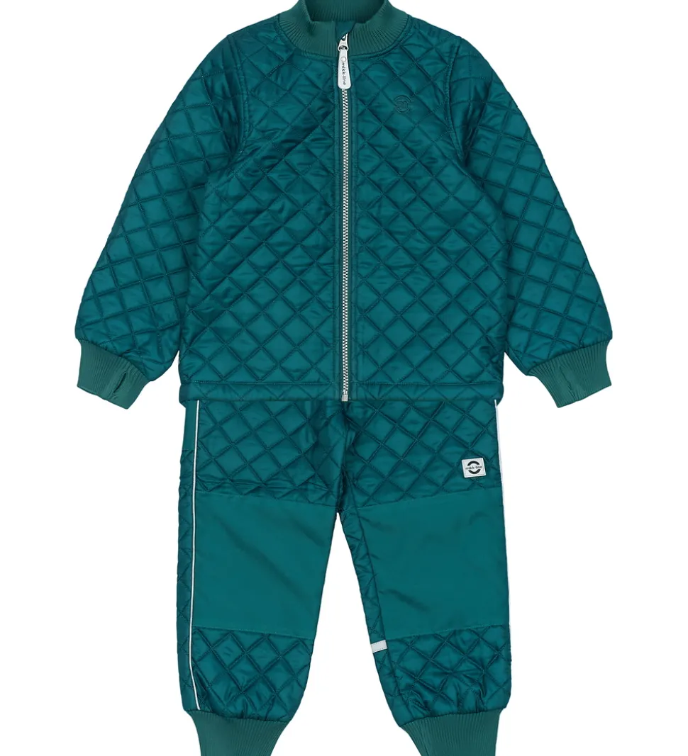 Fint Mikk-Line termotøj bestående af en termojakke og et par termobukser i grønblå med en quiltet struktur.