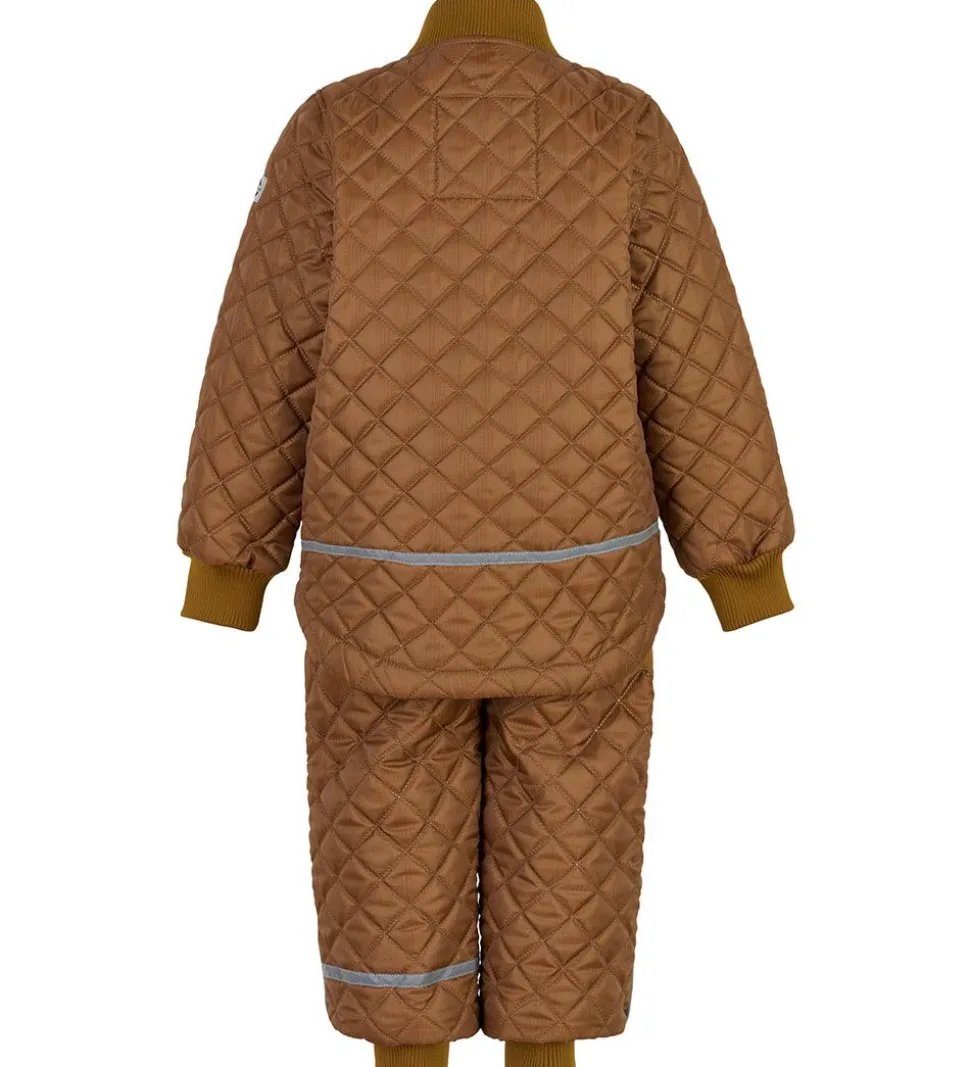 Smart Mikk-Line termotøj bestående af en termojakke og et par termobukser i brun i en glatvævet kvalitet og med en quiltet struktur.