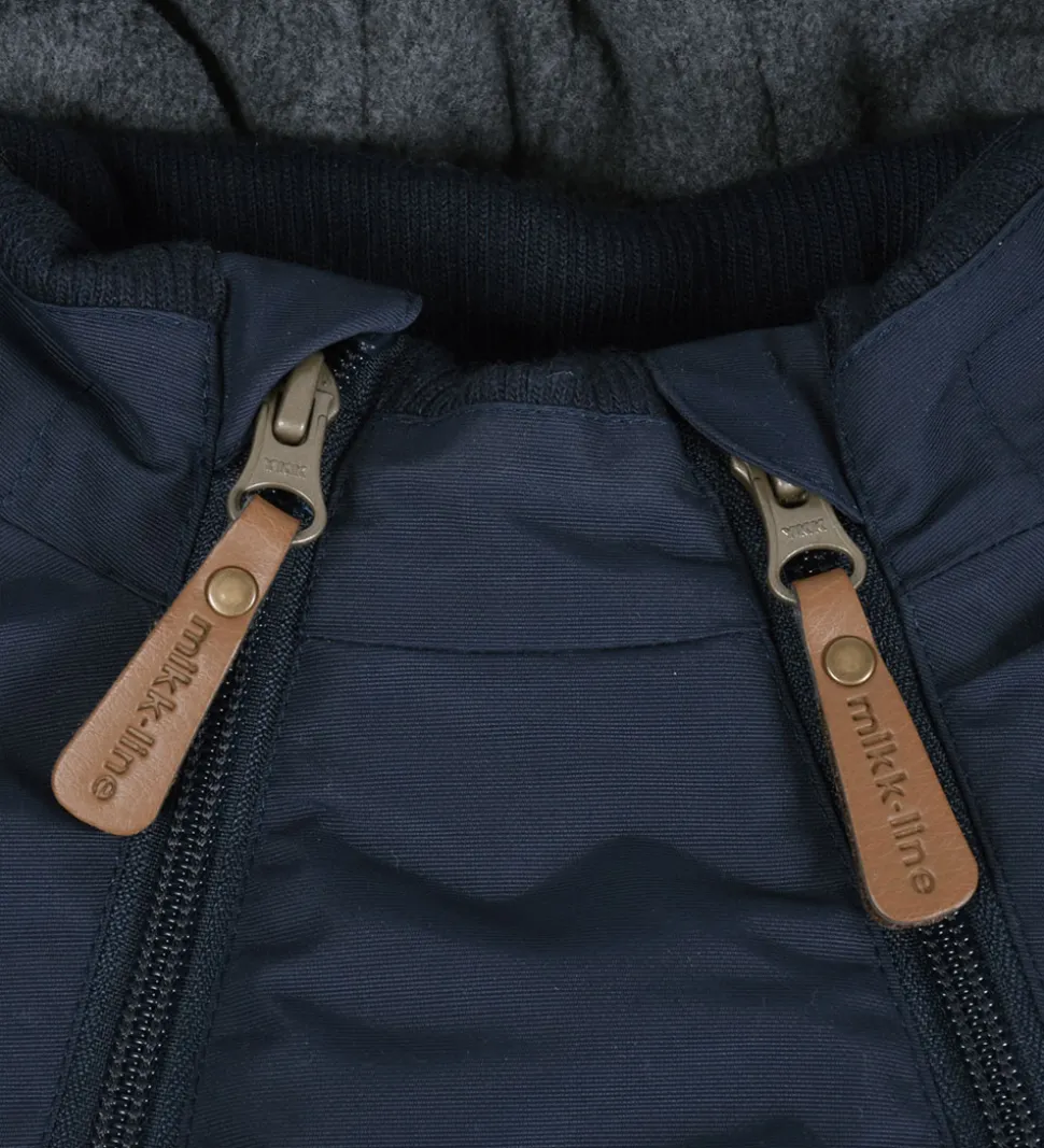 Mikk-Line vinterjakken åbnes fortil med to asymmetriske lynlåse med hagebeskytter og dobbelt vindstolpe. Den ene lynlås er kort, mens den anden er gennemgående fra hagen til venstre hofte. Indvendigt er der blødt fleecefor i kroppen og i hætten og glatvævet for i ærmerne. Vinterjakken har en varm polyestervattering.