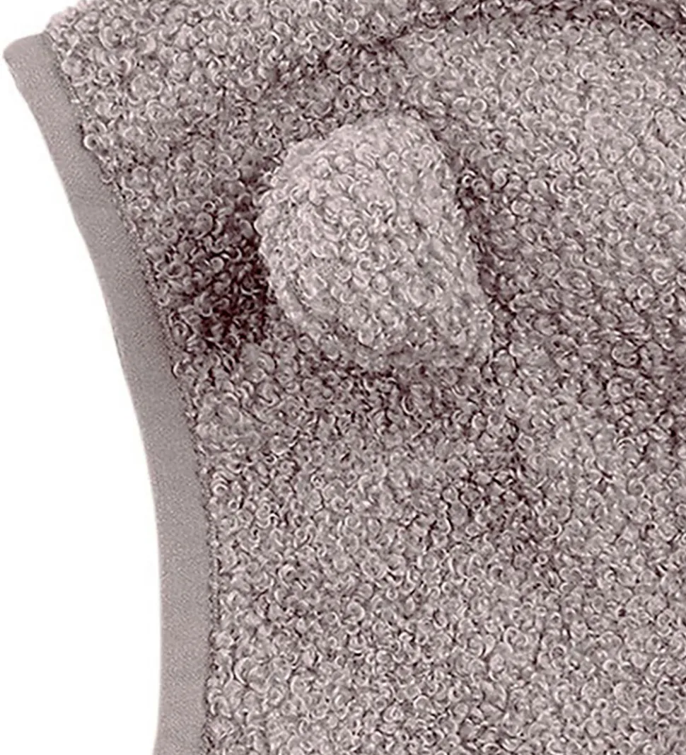 Mini A Ture elefanthuen har en rund hovedform med en smal elastik i nakken, så den sidder tæt til hovedet, og i toppen sidder der to søde ører. I ansigtsåbningen er der en smal kant, og i bunden har den et praktisk split-design. Elefanthuen består af ét lag, og på indersiden er der almindeligt, blødt fleece.