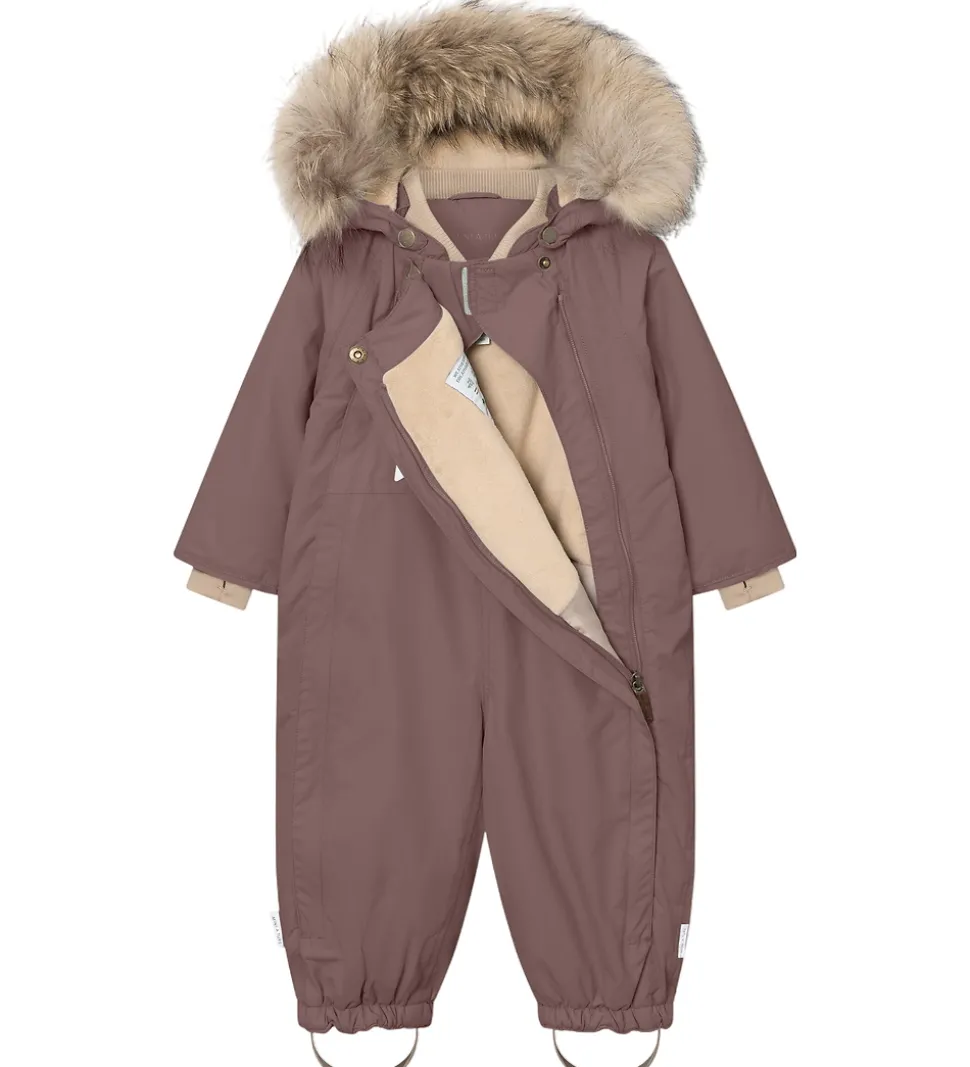 Skøn Mini A Ture flyverdragt i kastanjebrun. Flyverdragten er med beige for.