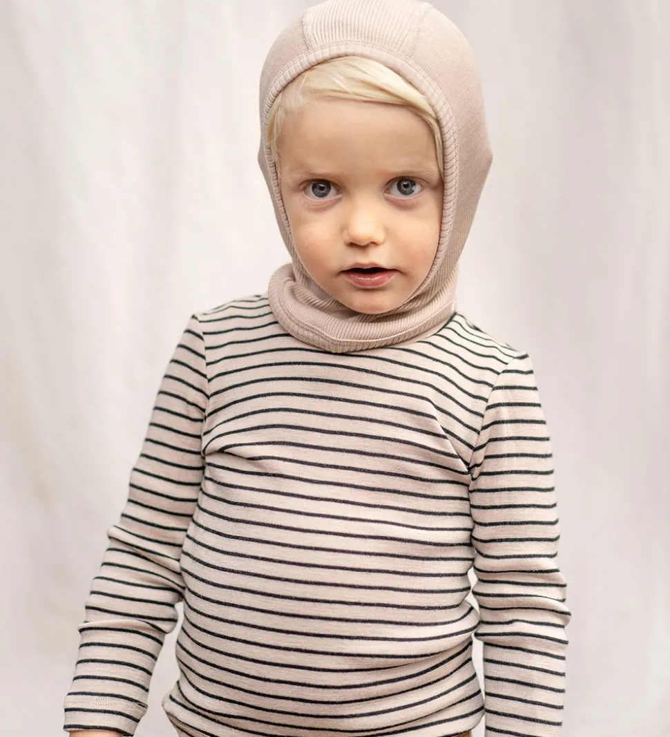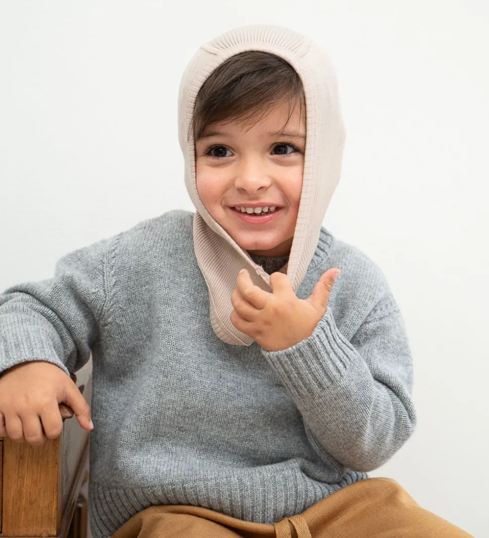 Lækker Minimalisma elefanthue i beige med ribstruktur, og den er lavet af blødt merinould. Minimalisma elefanthuen har en rund hovedform med en split-effekt i bunden, som giver et godt fit, og den består af et enkelt lag.