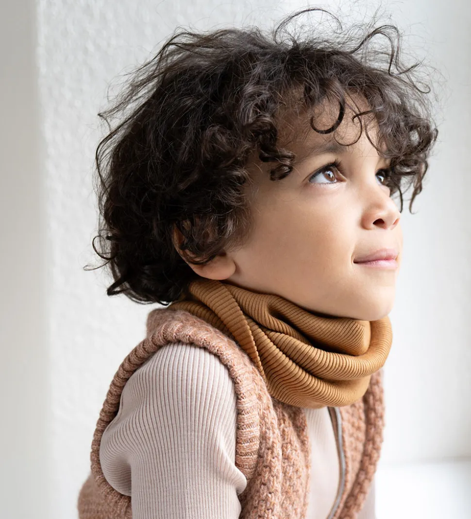 Skønt Minimalisma tube i karrgul med ribstruktur, og det er lavet af blødt merinould. Minimalisma tubetørklædet består af to lag i en let kvalitet.