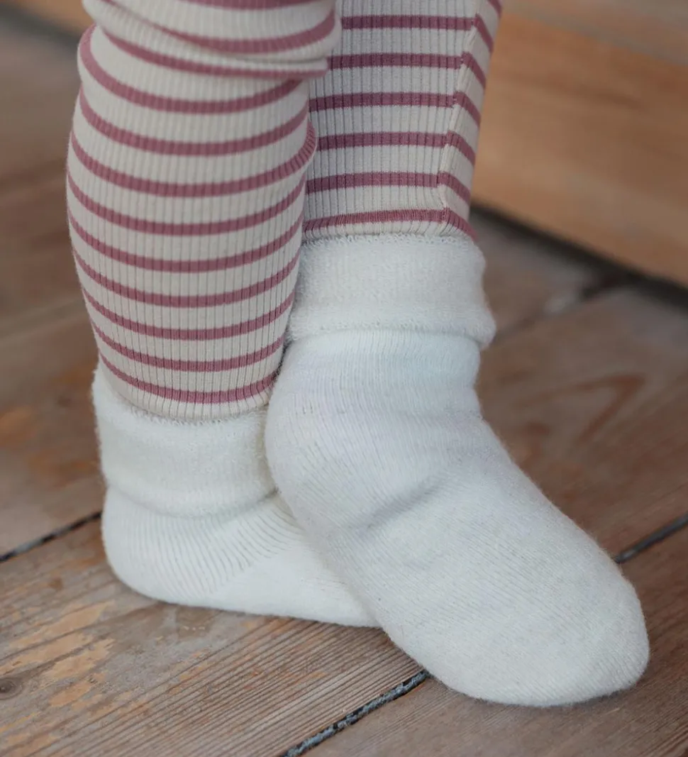 Bløde MiniPop strømper i enkel, ensfarvet hvid. MiniPop strømperne er er kraftige med en ekstra blød inderside, og de har et langt skaft, som kan bukkes om, hvis man ønsker det.
