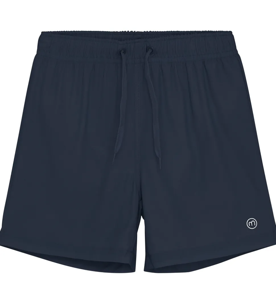 Funktionelle Minymo badeshorts i navy, med et logo på venstre lår. Materialet er ensfarvet og glat, hvilket skaber et enkelt og stilrent udtryk.