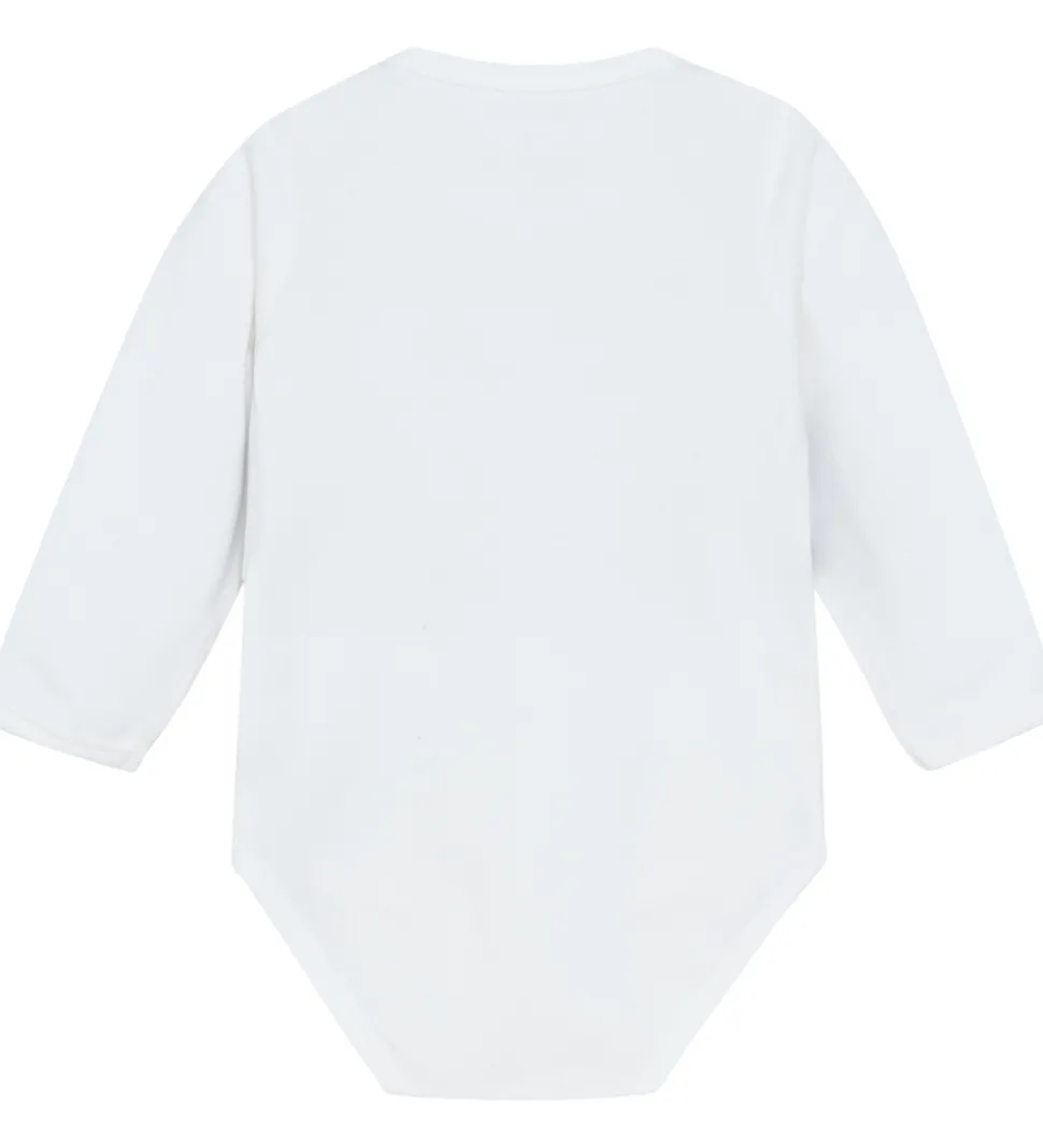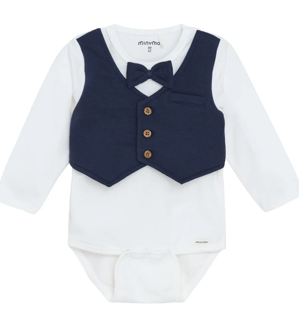 Elegant Minymo body i hvid med en påsyet vest og butterfly i navyblå. Minymo bodyen har en rund halsudskæring med tryknapper ved skuldrene og lange ærmer. Den lukkes mellem benene med trykknapper.