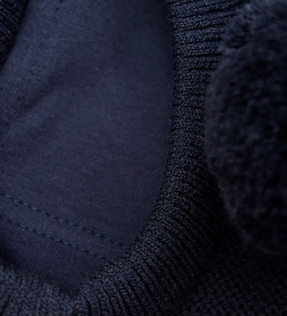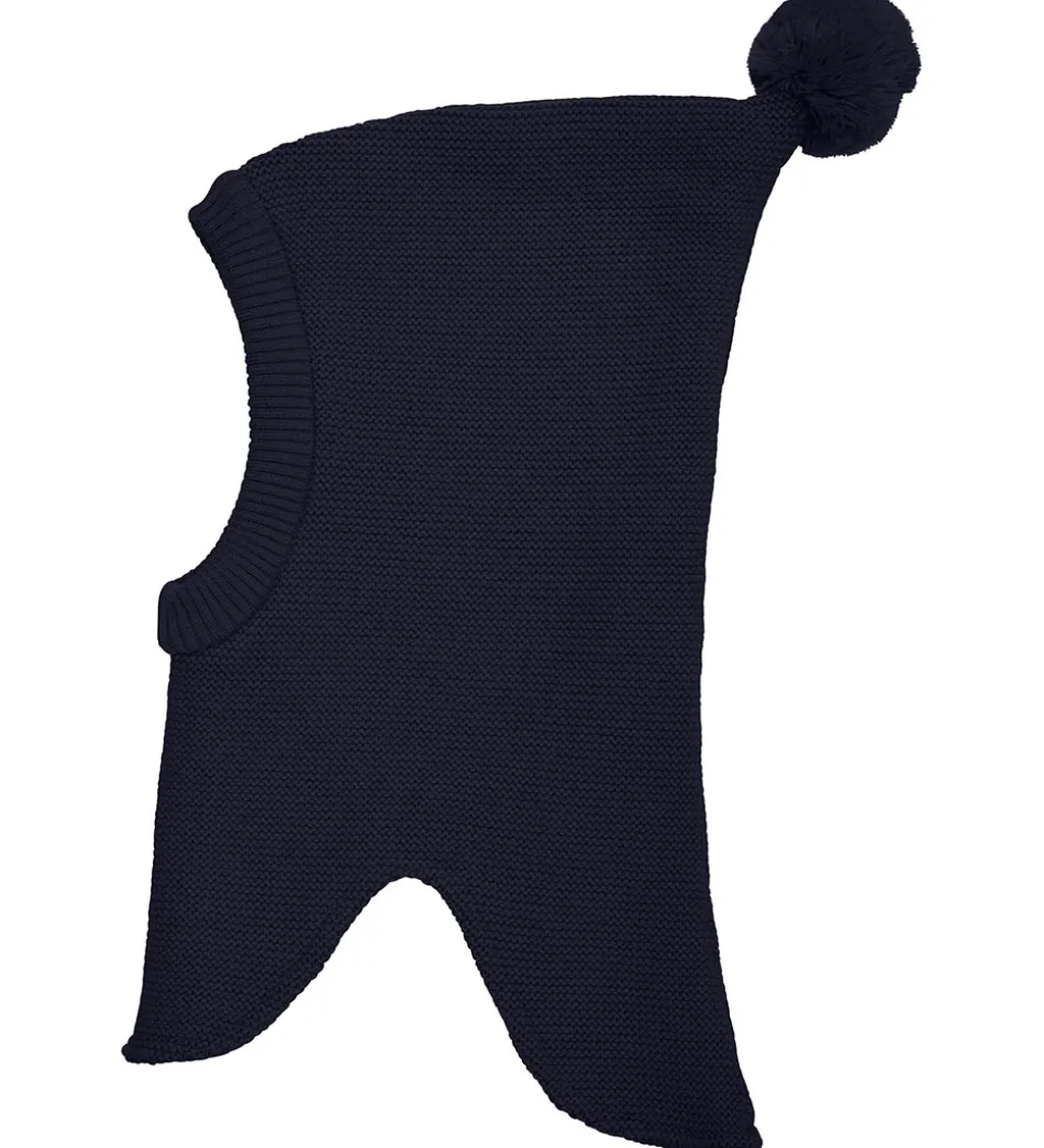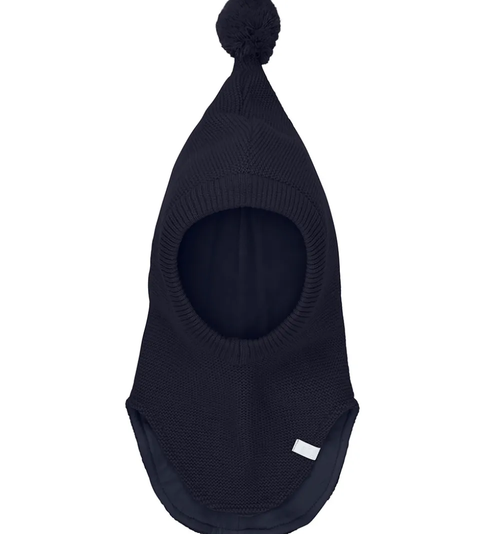 Fin Minymo elefanthue i navyblå med strikket struktur. Minymo elefanthuen har en spids facon med ribkant omkring ansigtet og en kvast på toppen. Nederst er der et smart split-design. Elefanthuen består af to lag med bomuld inderst og en blanding af uld og polyakryl yderst.