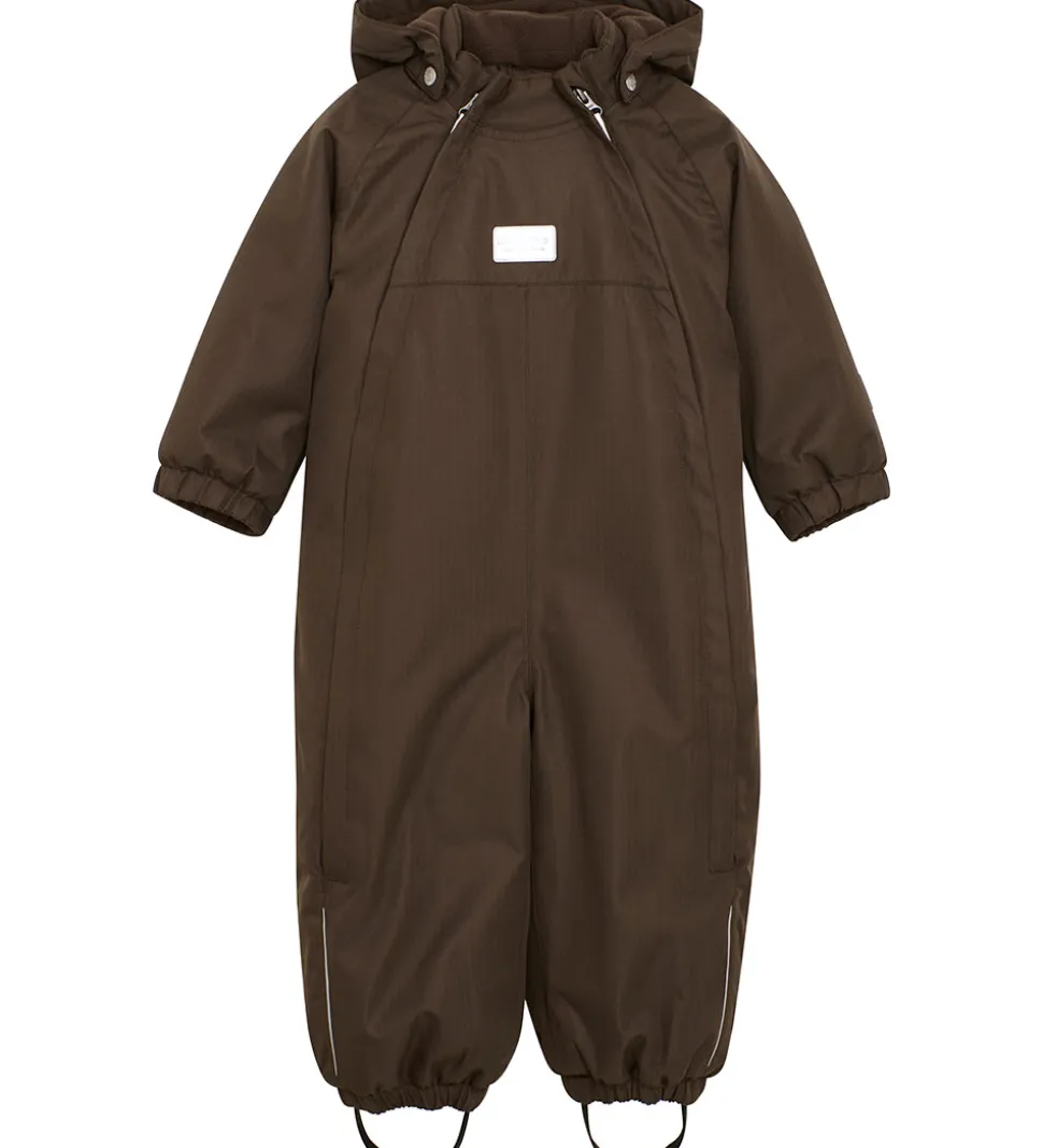 Dejlig Minymo flyverdragt i mørkebrun med flere velplacerede refleksapplikationer og -detaljer.
