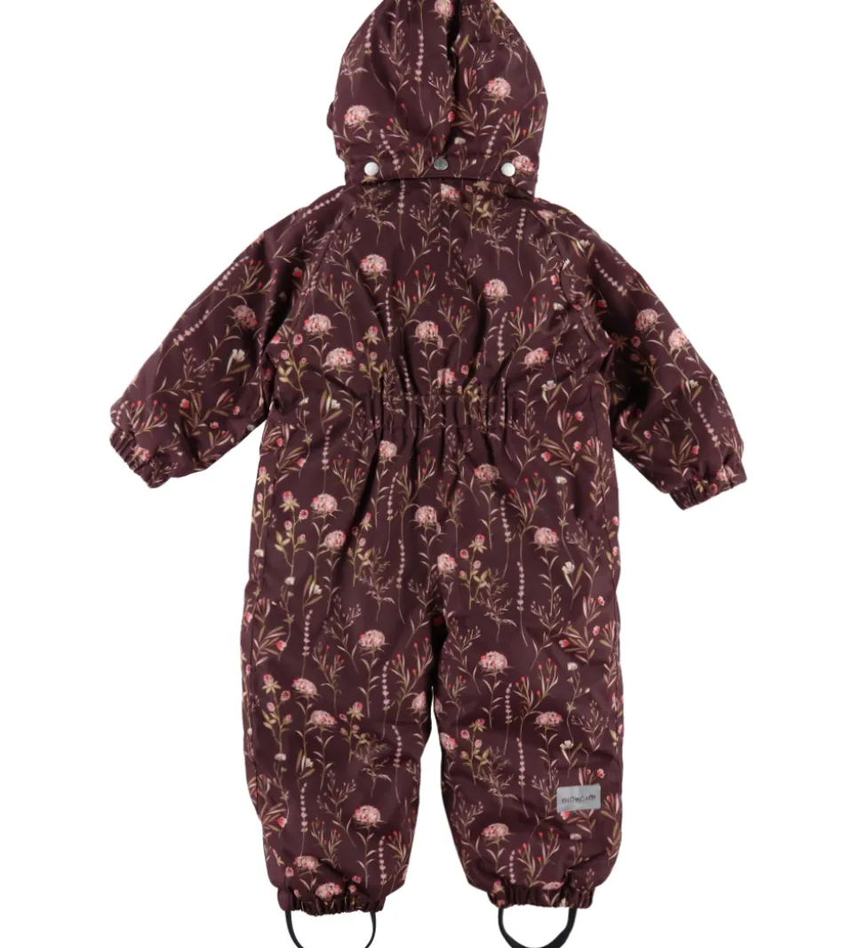 Dejlig Minymo flyverdragt i mørk lilla med et rosa alloverblomsterprint. Flyverdragten har flere velplacerede refleksapplikationer og -detaljer.