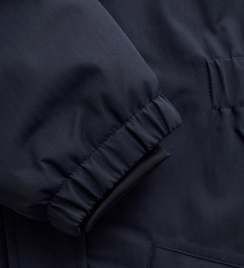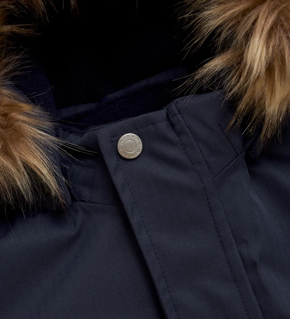 Flot Minymo flyverdragt i mørkeblå med praktiske refleksdetaljer.