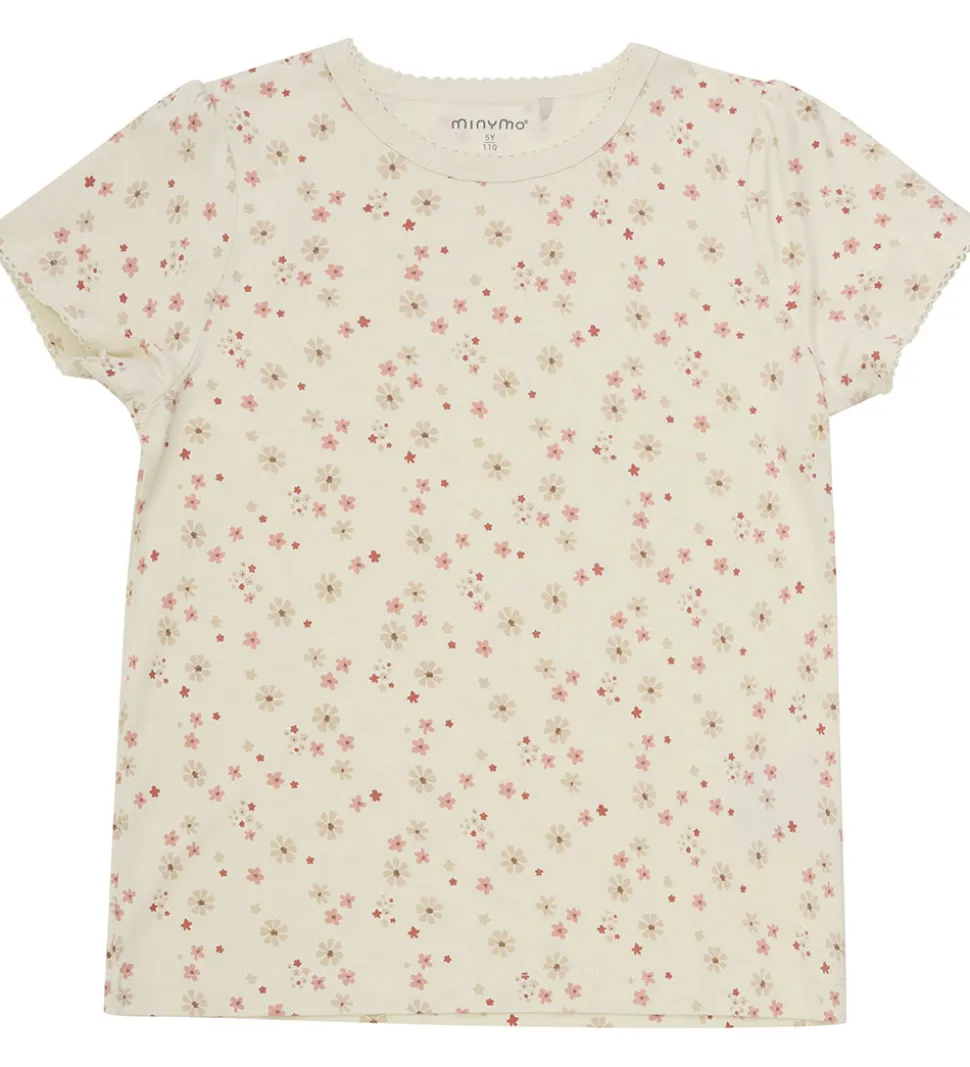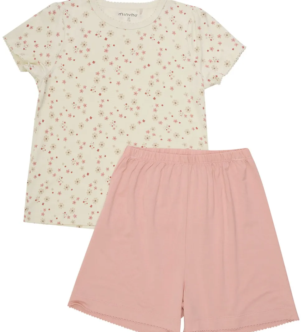Fint Minymo nattøj bestående af en t-shirt og et par shorts. T-shirten er i beige med et alloverblomsterprint og shortsene er ensfarvet rosa.