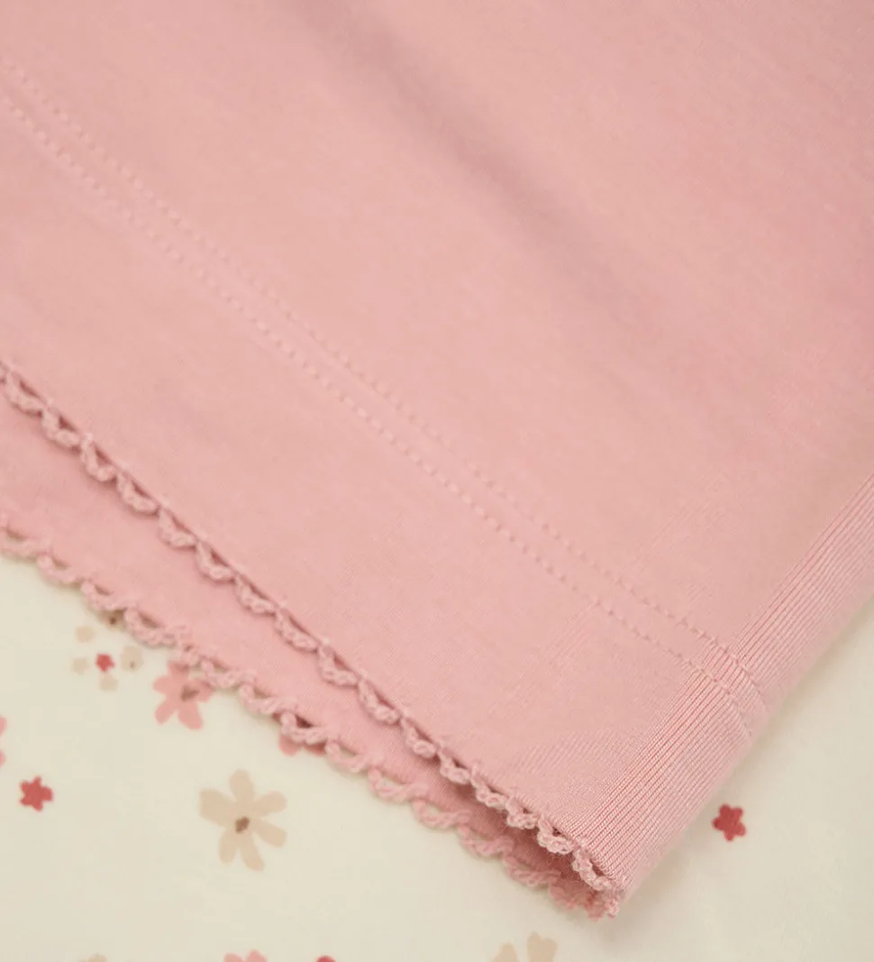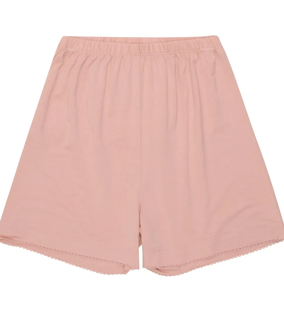 Minymo t-shirten har kort ærmer og en rund halsåbning med en smal blondekat. Shortsene har en smal elastikkant i taljen, så de bliver siddende som de skal og en fin blondekant i slutningen. Nattøjet er lavet i en blød kvalitet.