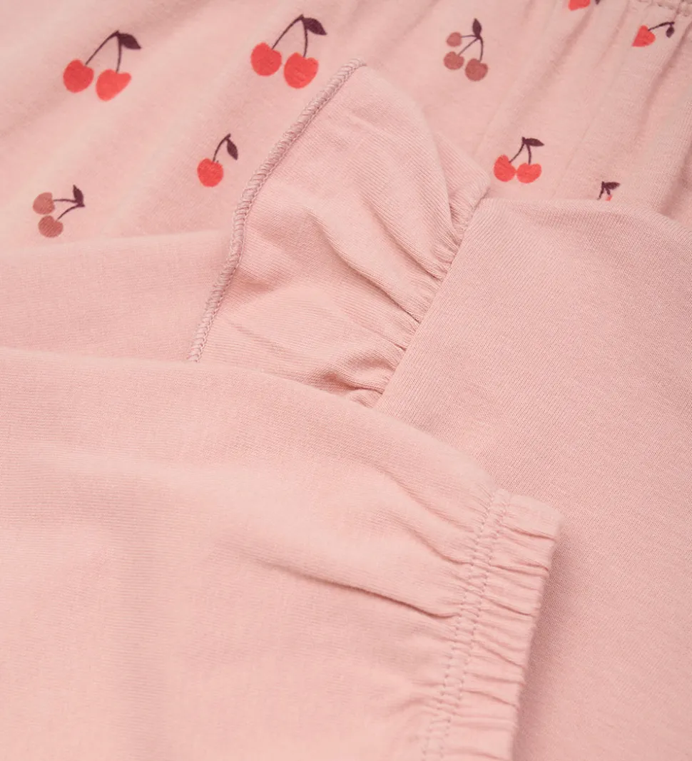 Dejligt Minymo nattøj i en blød rosa farve. Minymo sættet har en langærmet bluse med et charmerende kirsebærprint på fronten og matchende bukser med et all-over kirsebærmønster.