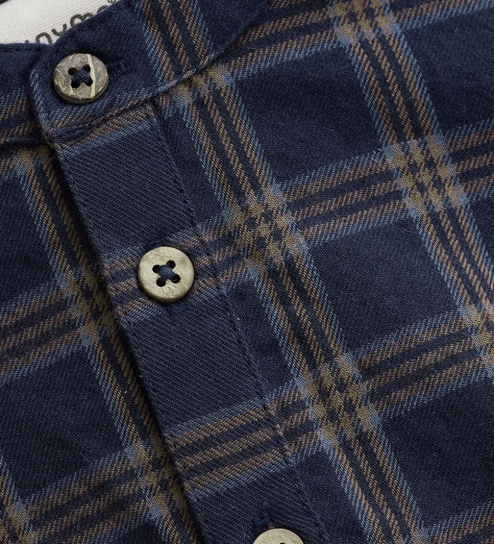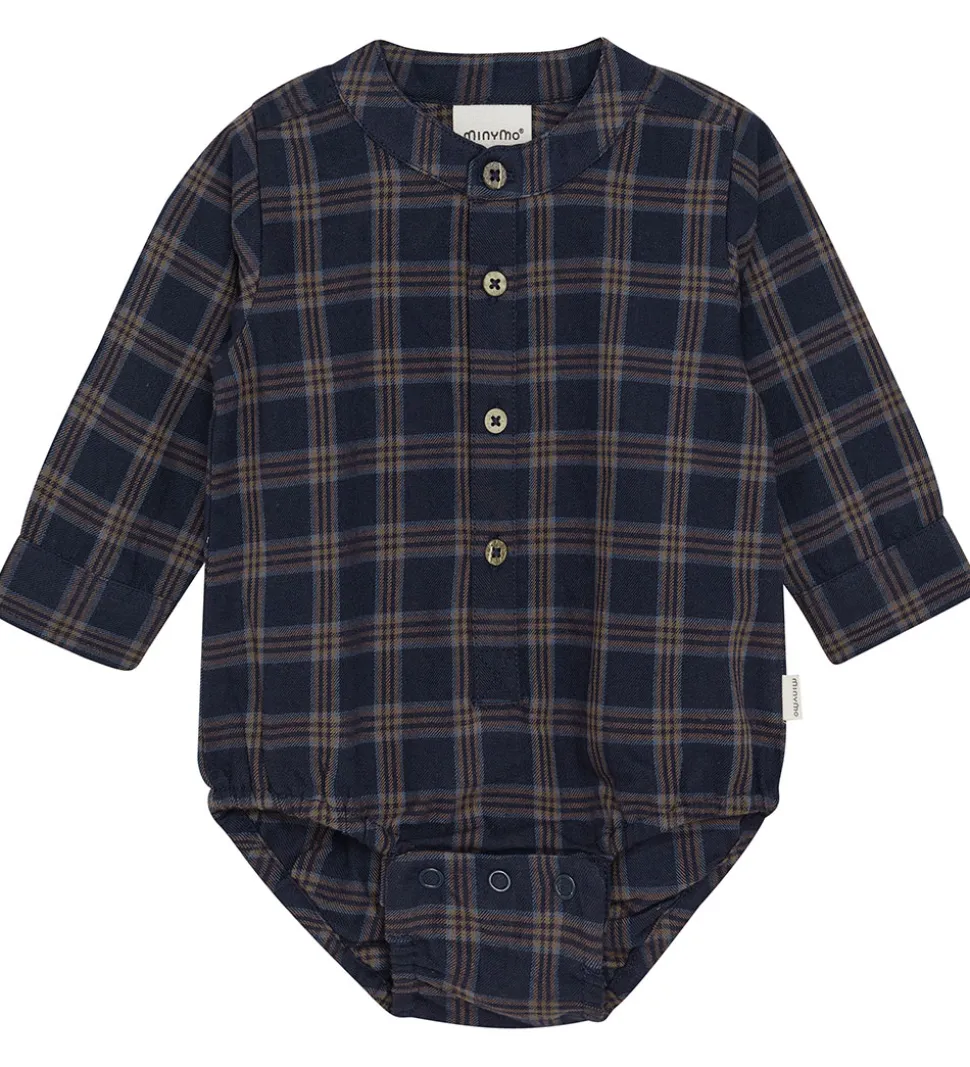 Elegant Minymo skjortebody i mørkeblå med ternet print i brune nuancer. Skjortebodyen har en klassisk rund halsudskæring med en kinakrave og knapper fortil. Den har lange ærmer med manchetknapper ved håndleddene. Minymo bodyen har en behagelig pasform med elastikkanter ved benåbningerne. Den lukkes mellem benene med trykknapper.