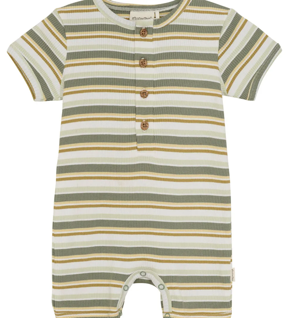 Lækker Minymo sommerdragt med et stribet design i grønne, gule, hvide og brune nuancer og en lækker ribstruktur.