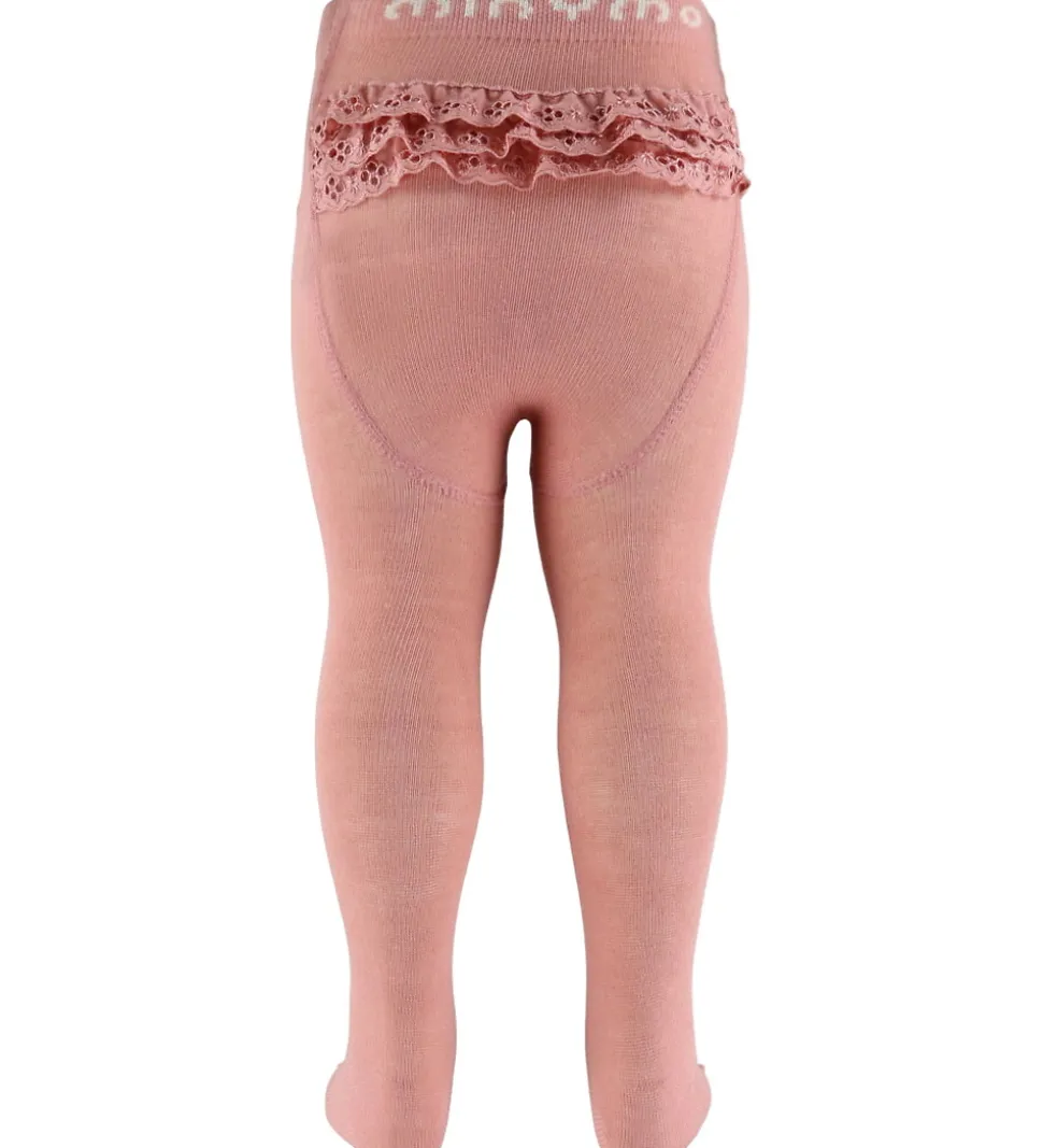 Søde Minymo strømpebukser i ensfarvet rosa, med tre fine blonder bagpå.