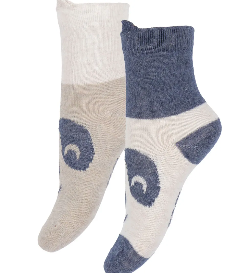 Charmerende Minymo strømper solgt i en 2-pak. Det ene par er beige med et pandamotiv, mens det andet par er cremefarvet og meleret navy med et pandamotiv.