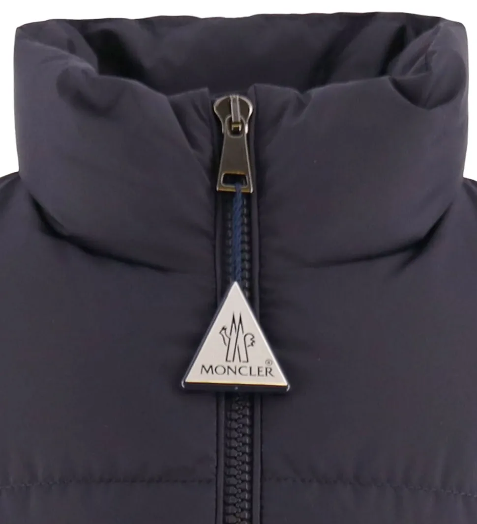 Lækker Moncler dunjakke i navyblå, og øverst på venstre ærme er der et filt-mærke med et Moncler-logo.
