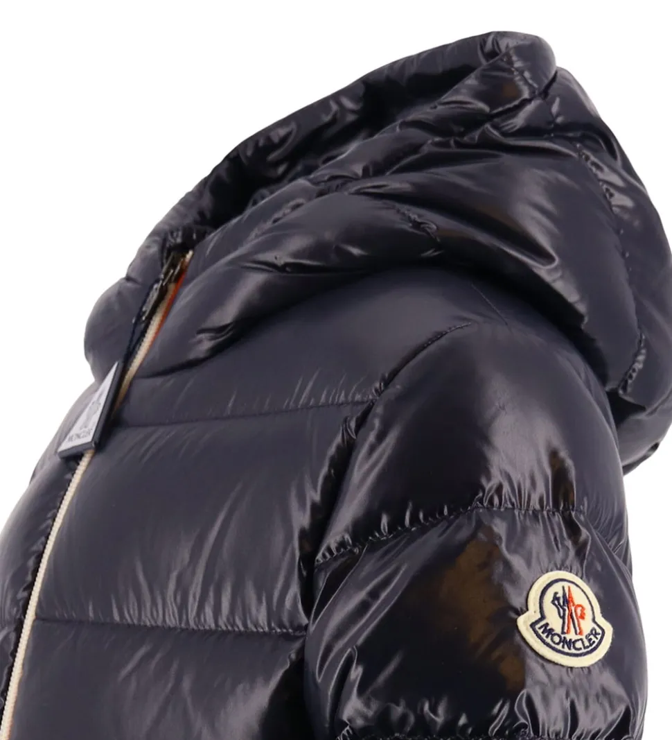 Smart Moncler dunjakke i navyblå, og ved lynlåsen er der en hvid og rød stribe. Øverst på venstre ærme sidder der et filt-mærke med et Moncler-logo.