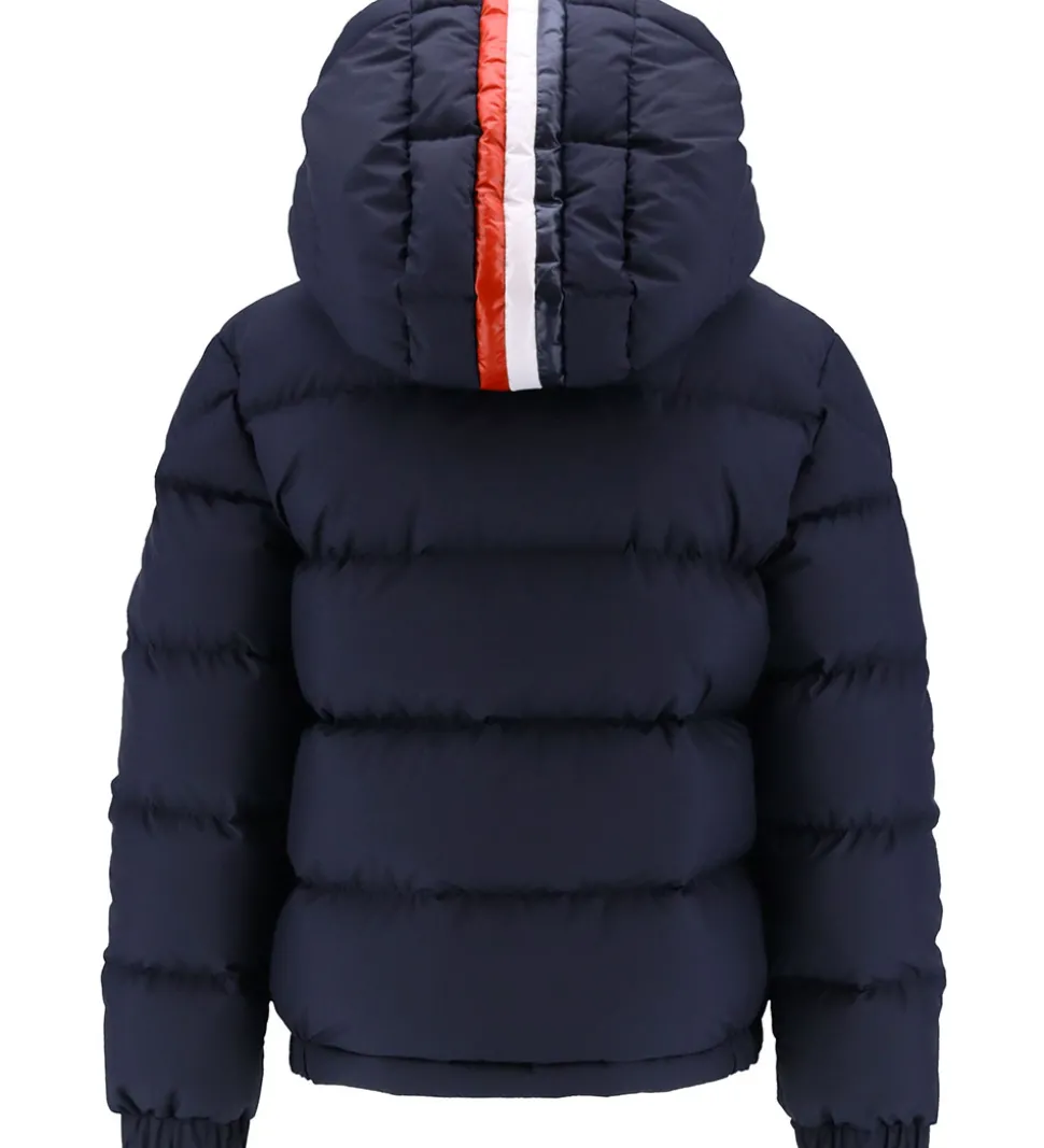 Smart Moncler dunjakke i navy, og over hætten er der en bred stribe i logofarverne navy, hvid og rød. Øverst på venstre ærme er der et filt-mærke med et Moncler-logo.