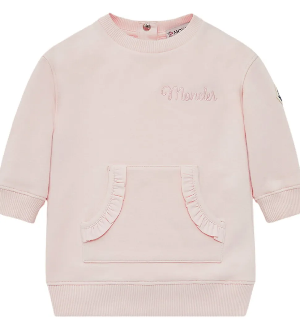 Elegant Moncler sweatkjole i lys rosa. Moncler sweatkjolen har lange ærmer og brede ribkanter, og fortil sidder der en kængurulomme med søde flæsekanter. Sweatkjolen lukkes i nakken med trykknapper, og på indersiden er der blødt, børstet bomuld.