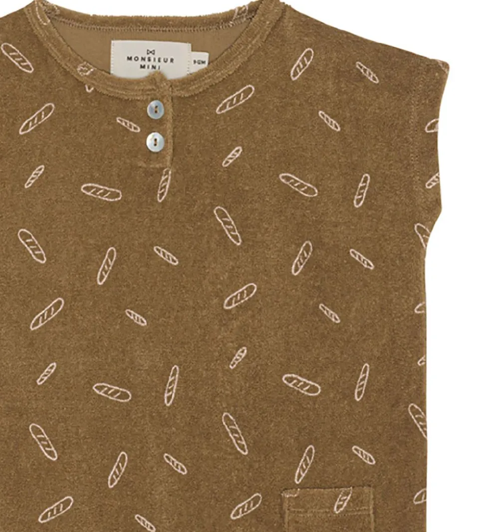 Sød Monsieur Mini sommerdragt i brunt frotté med et allover print af baguettes.