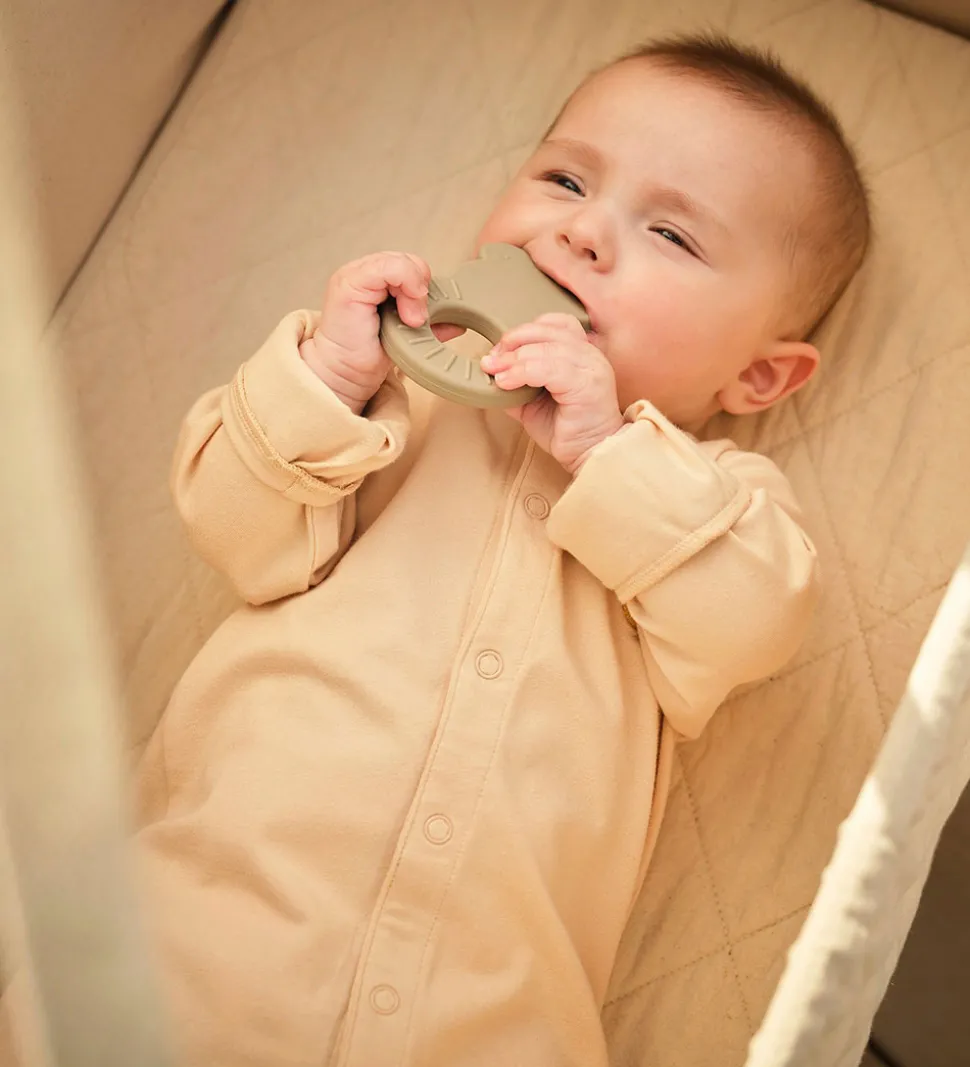 Både natdragten og babyhjelmen har trykknapslukninger og praktiske kanter, og der er smarte ombuk til faste hænder og fødder. Kvaliteten er blødt og strækbart, økologisk bomuld.