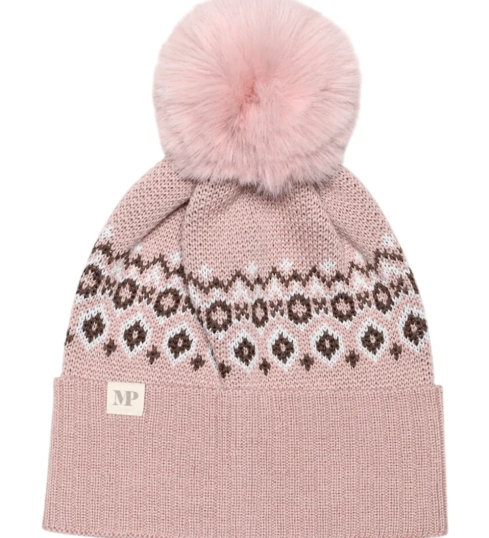 Sød MP hue i rosa med et mønster i brun og hvid, og i toppen sidder der en stor kvast af imiteret pels.