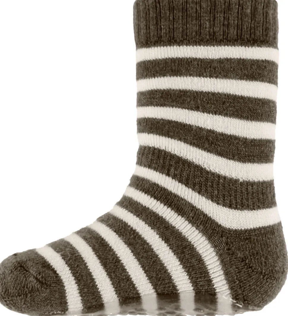 Fine MP strømper med striber i brun og hvid. MP strømperne har et langt skaft og en smal ribkant øverst. Strukturen er blød og fleksibel, hvilket sikrer en god pasform. Under bunden er der en praktisk bund med gummidutter, som sikrer barnet et godt fodfæste.