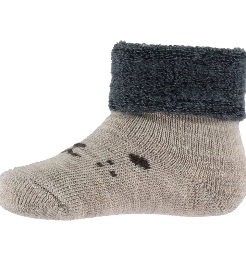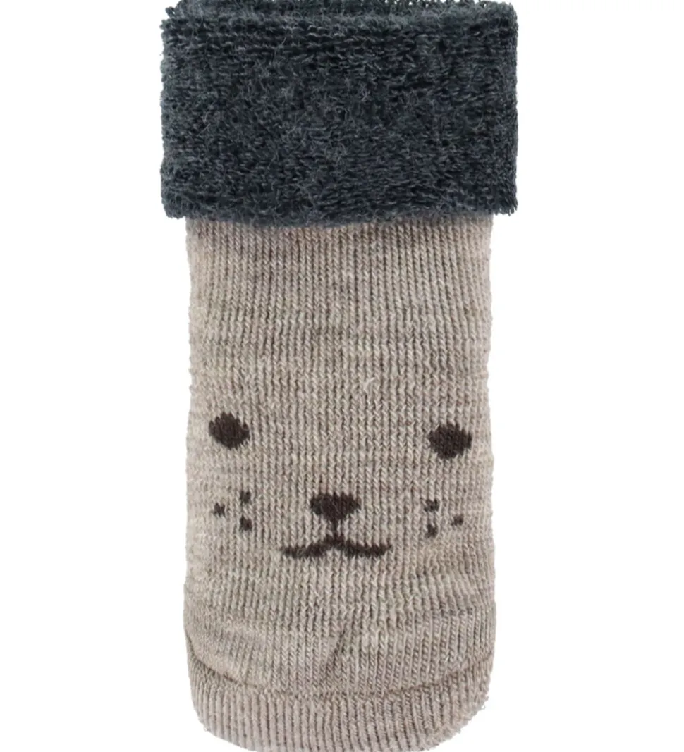 Dejlige MP strømper i en meleret, lysebrun nuance med et diskret ansigtsmønster og en bred, mørkegrå, opslået ribkant. MP strømperne har en en ombukket kant. Kombinationen af materialer sikrer en god pasform og elasticitet.
