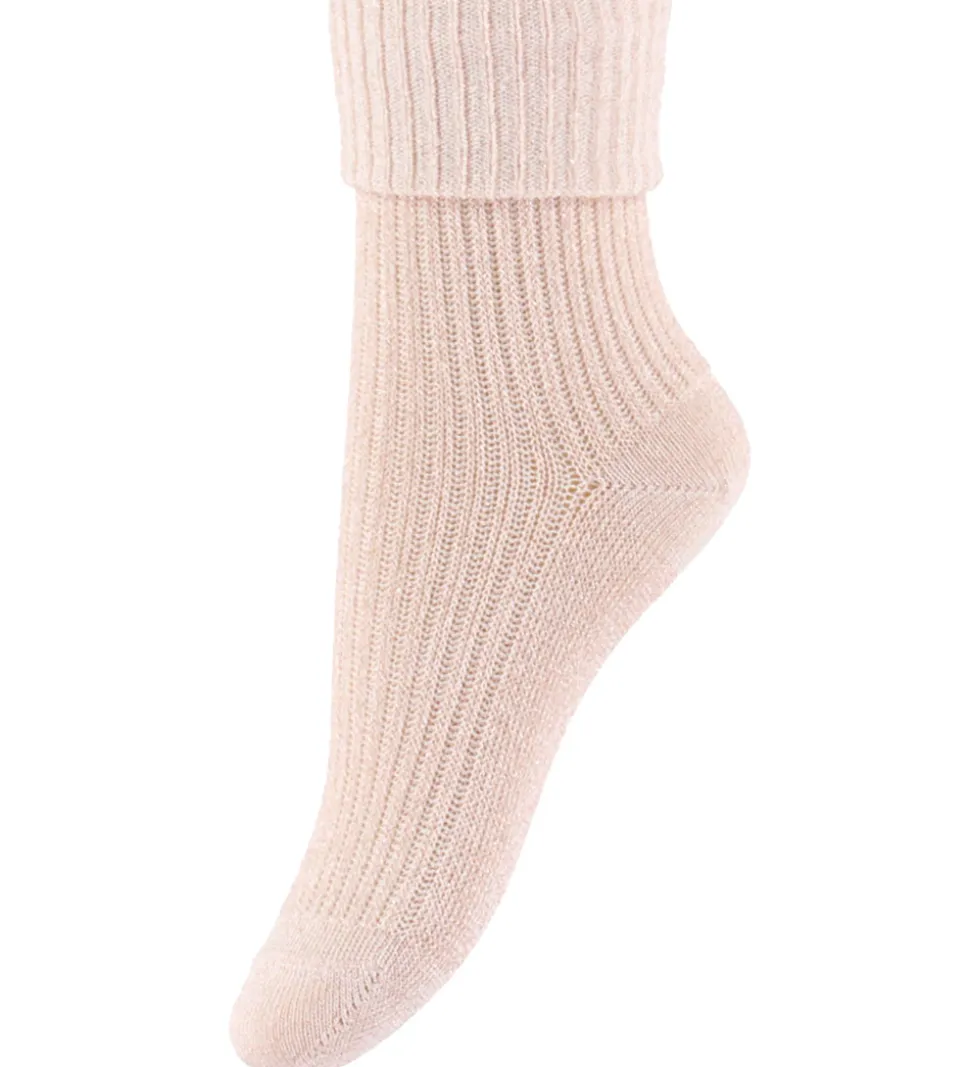 MP strømperne har et ribstrikket design med en foldbar kant øverst, der giver fleksibilitet og en god pasform til foden. Den bløde tekstur gør dem velegnede til daglig brug.