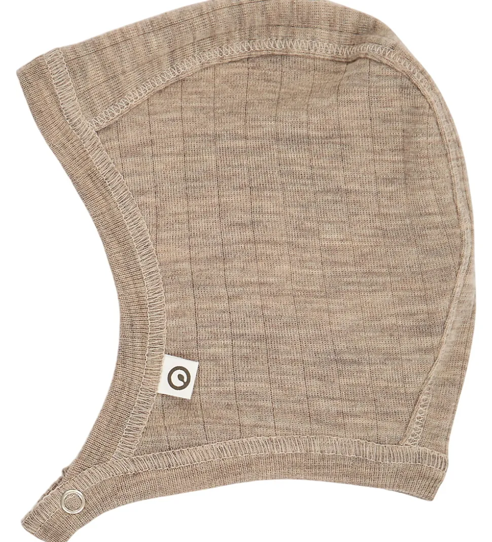 Fin Müsli babyhjelm i beige med ribstruktur. Müsli babyhjelmen har en rund hovedform, og den lukkes under hagen med en trykknap. Babyhjelmen er lavet af blødt, økologisk merinould i en let kvalitet.