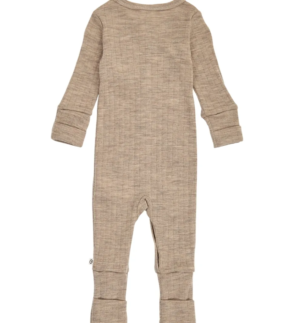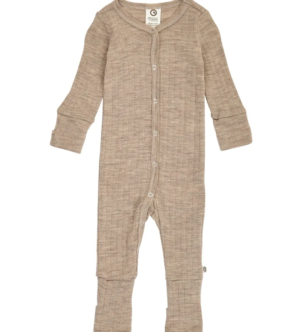 Fin Müsli heldragt i ensfarvet beige med ribstruktur. Müsli heldragten har lange ærmer og ben med praktiske ombuk, og den åbnes med trykknapper hele vejen ned ad fronten og ned ad højre bukseben indtil kanten. Heldragten er lavet af blødt, økologisk merinould i en let kvalitet.