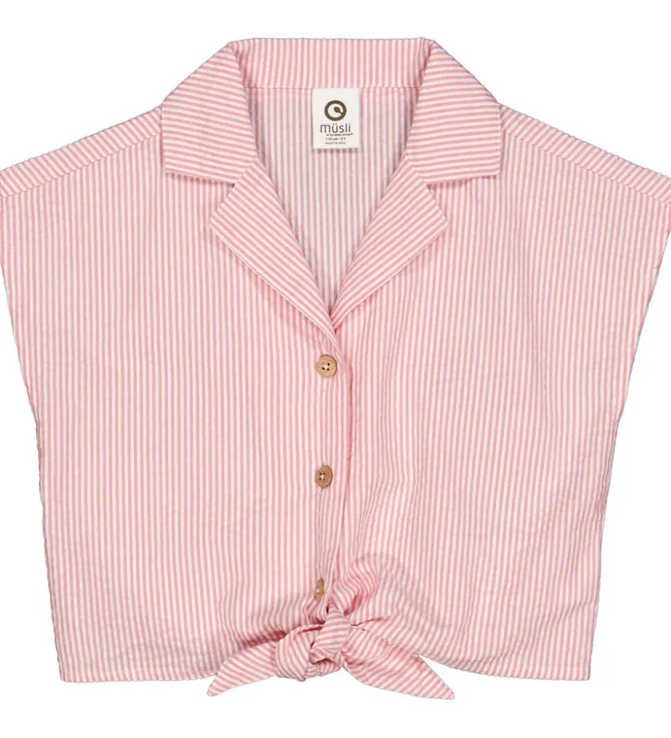 Fin Müsli skjorte i hvid med rosa striber. Skjorten er uden ærmer og har en fin krave og træknapper fortil. Skjorten er en kort model med et bindebånd nederst.