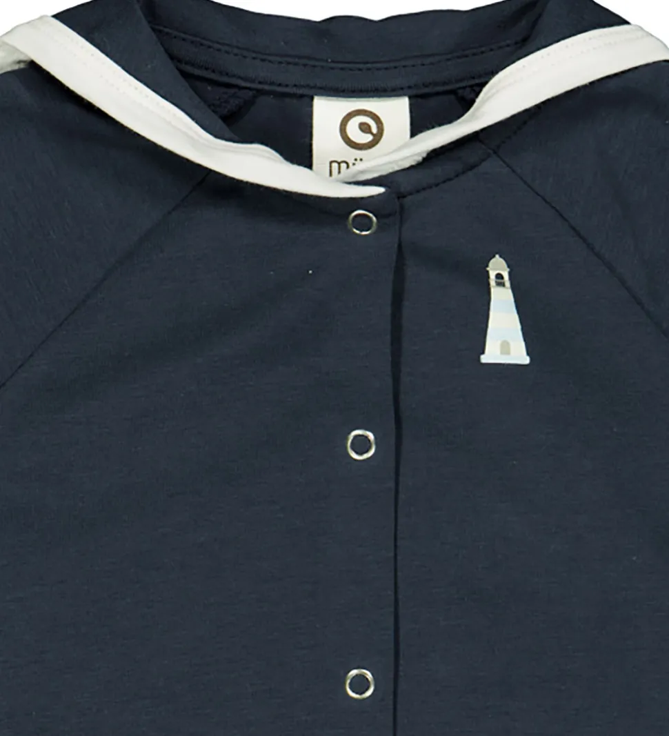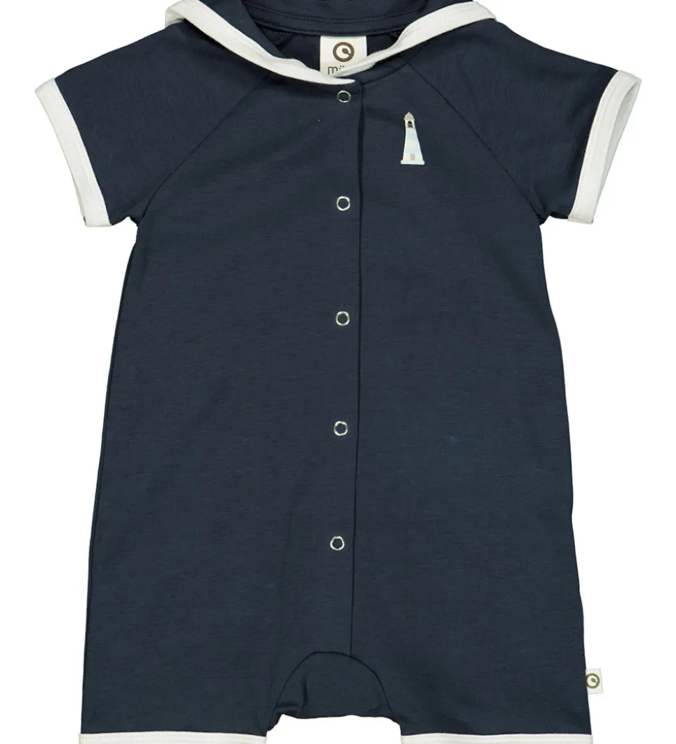 Praktisk Müsli sommerdragt i en dyb, blå nuance med hvide kanter og praktiske trykknapper. Sommerdragten har korte ærmer og et dekorativt, lille fyrtårn printet foran. Perfekt for en let og stilren påklædning.