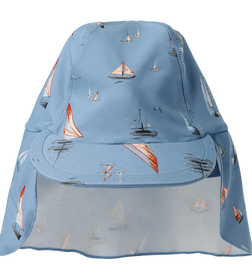 Fin Name It badehat i en lys blå farve med et fint sejlbådsprint.