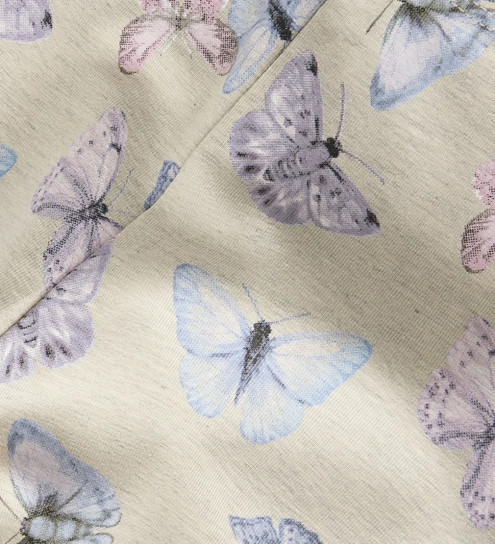 Fine Name It shorts i lys, meleret beige med et fint sommerfugleprint i lilla og blå nuancer. Name It shortsene har en elastisk talje og en tætsiddende pasform.