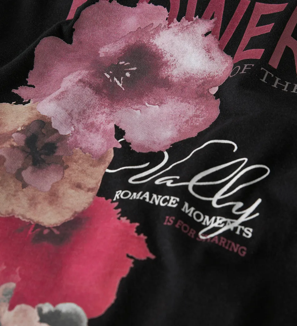 Elegant Name It bluse i sort, dekoreret med et flot blomsterprint på forsiden i rosa. Blusen har en rund halsudskæring med en smal ribkant og lange ærmer.