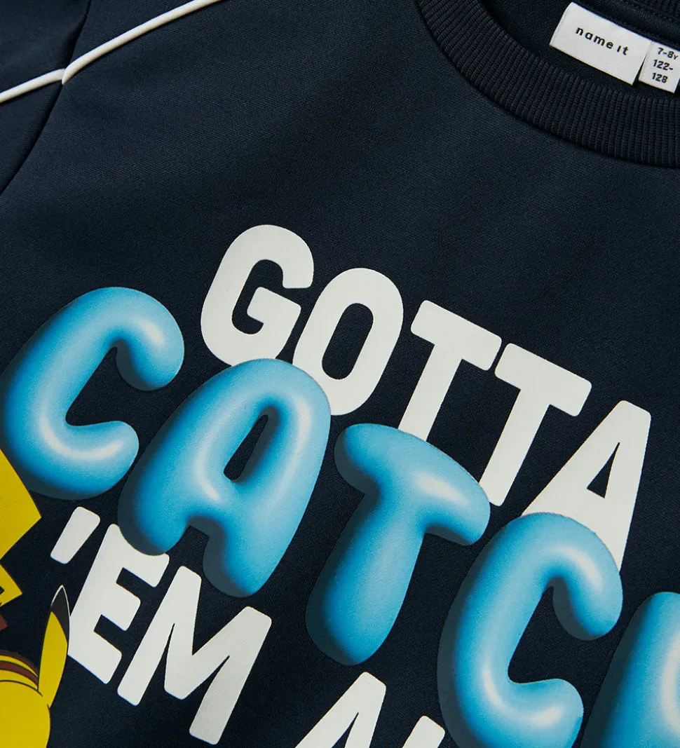Sej Name It bluse i navyblå med et stort print på fronten af Pikachu og teksten “Gotta Catch ‘Em All”. Blusen har facon som en sweatshirt med ribkanter ved åbningerne. Blusen har hvide konstraststriber ved ærmerne, og den er fremstillet af polyester.