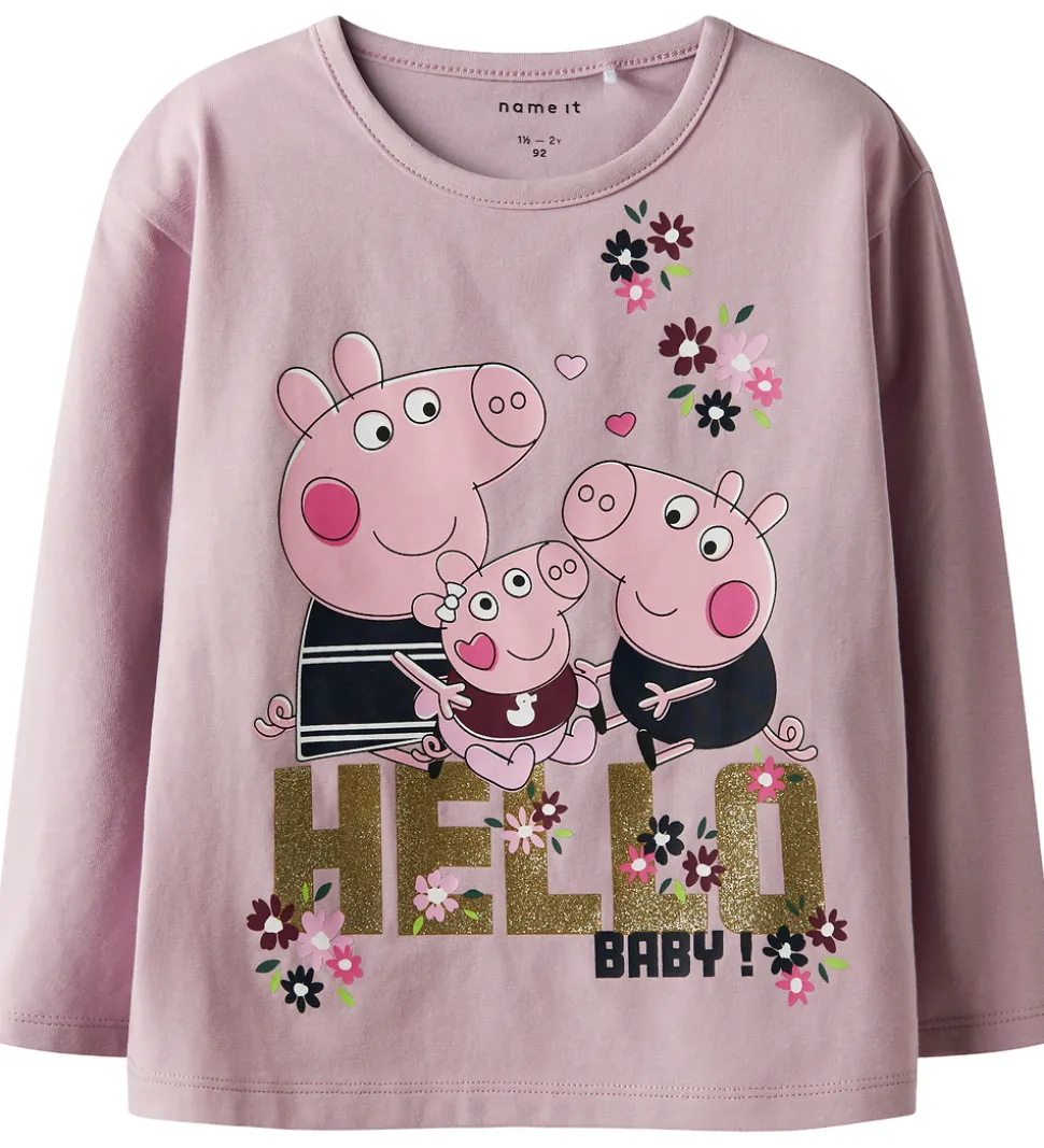 På forsiden er der et farverigt print af Gurli Gris omgivet af små blomsterdetaljer. Under printet står teksten “HELLO BABY” i glitrende guld. Blusen har en rund halsudskæring, der tilføjer et klassisk touch. Name It blusen kombinerer stil med et muntert design.