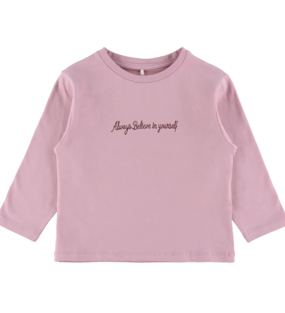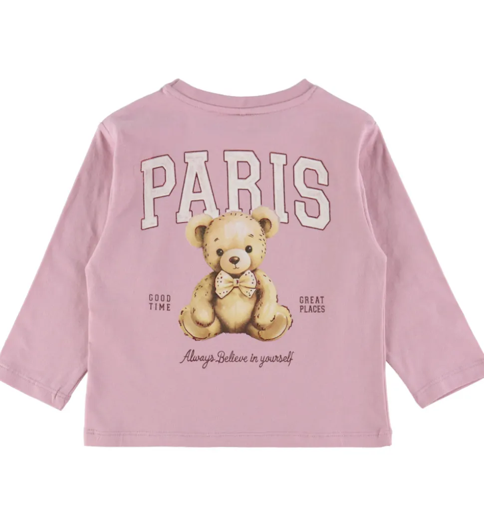 Elegant Name It bluse i en sart rosa nuance med lange ærmer. Blusen har et tekstprint på forsiden, og på ryggen er et stort print med en bamse og glimmerdetaljer. Name It blusen er designet med en rund halsudskæring, der giver et enkelt og tidløst udtryk.